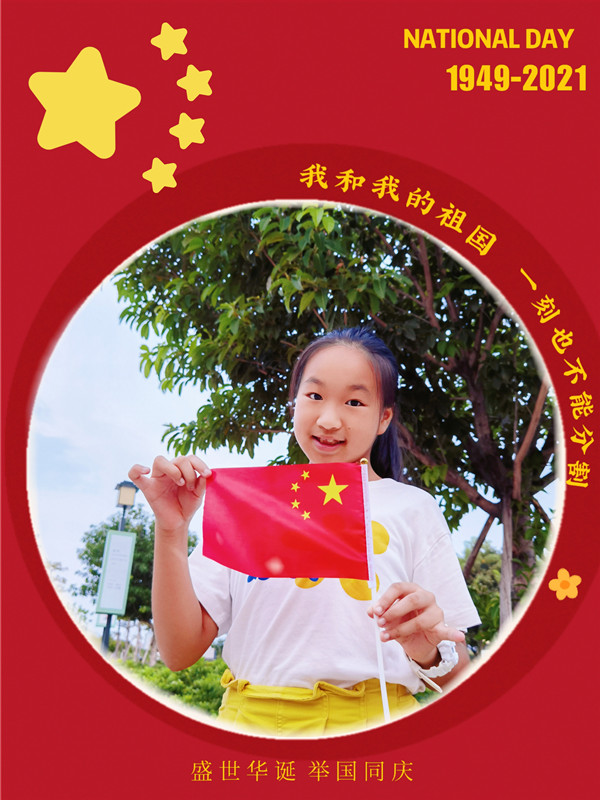 2021年10月1日是祖国母亲七十二华诞,碧桂花城学校开展了“童心向党,我与国旗合个影”的教育实践活动。同学们用笑脸和国旗合影,表达自己的爱国情怀,祝福祖国繁荣昌盛。