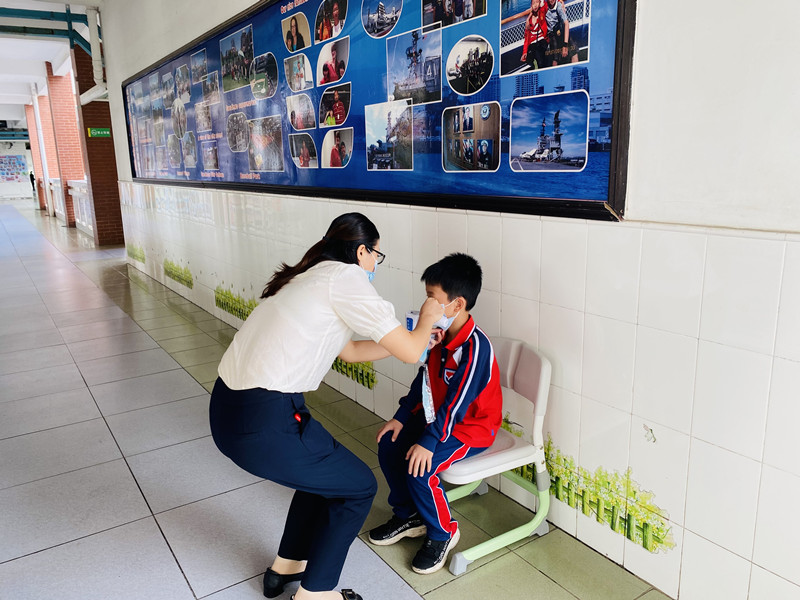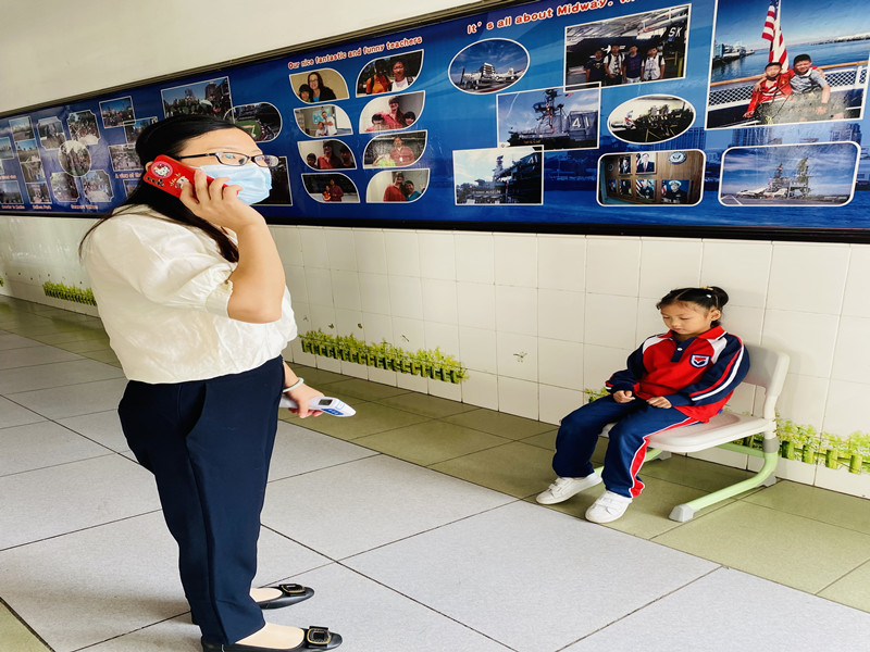 一(4)班老师正在上语文课,发现一名同学精神萎靡,并伴有咳嗽等疑似症状。老师立即手持体温测试仪进行体温测量发现高于37.3度,自己将该名学生带离教室,并及时将情况报告校医。由身着隔离服的校医对该生体温进行复核,之后迅速将其带至学校隔离室再用水银体温计测量体温,同时通知家长及时接走救治。消校医对患病学生所在班级和隔离室进行消毒。