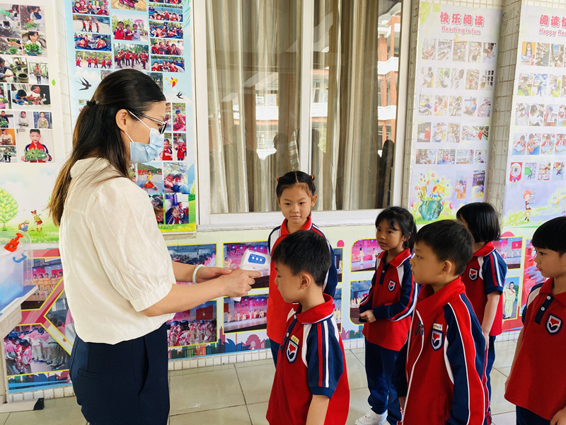 演练现场,学生们排着整齐的队伍在班级门口接受教师手持测温仪测量体温,体温正常的学生将手部用消毒液消毒后迅速进入教室。