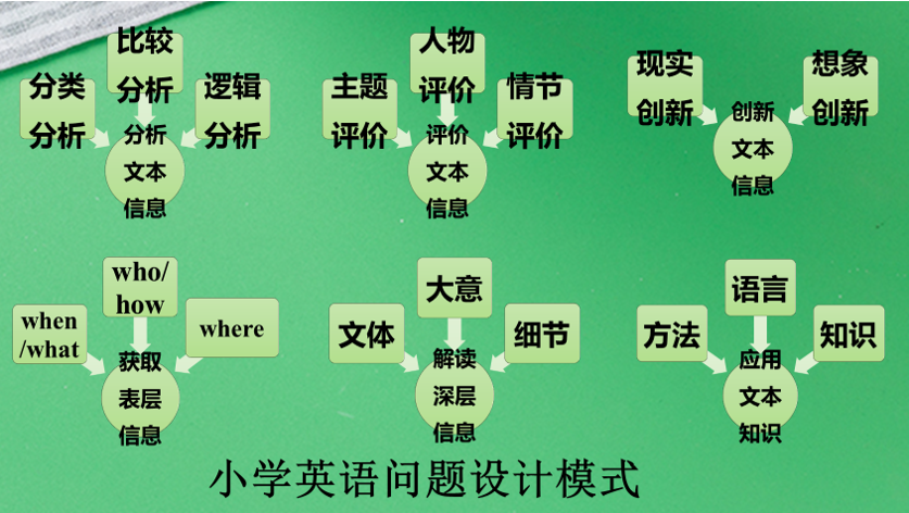 段娜老师认为,小学英语阅读问题主要从以下六大方向进行设计,包括获取表层信息、解读深层信息、应用文本知识、分析文本信息、评价文本信息和创新文本信息。阅读理解的题型主要包括判断正误、回答问题、多项选择、完成句子、排序和匹配。