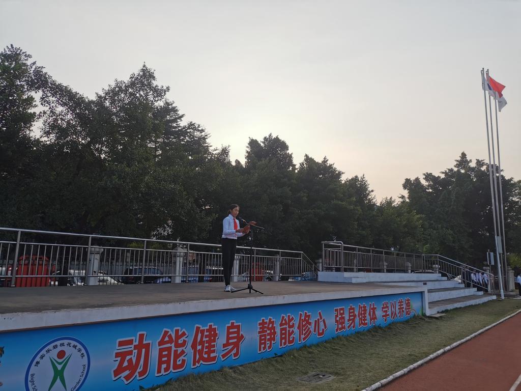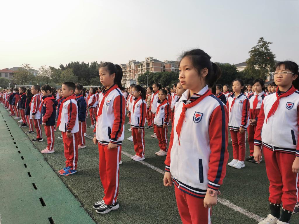“起来,不愿做奴隶的人们……”伴着同学们嘹亮的国歌声,鲜艳的五星红旗徐徐升起。随后,由五(5)班的覃伊涵进行国旗下讲话,她说到:“少年强则国强,我们是初升的太阳,是祖国的未来和希望,我们要记住“耻辱”,记住祖国历史的创伤,珍惜今天来之不易的幸福生活,努力学习,为中华民族的伟大复兴而努力学习!”最后,她号召同学们在国旗下庄严宣誓:勤奋学习,报效祖国!勿忘国耻,振兴中华!