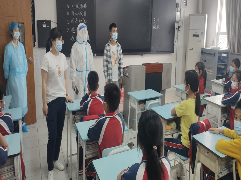 上课期间,当任课老师发现一名学生出现发热情况时,老师马上使用额温枪进行测温,确定这名学生发热后,将情况报告给班主任和校医。在校医到达教室前,班主任和任课老师让班级里所有学生佩戴好口罩,引导其他学生有序转移到备用教室,继续进行测温排除。