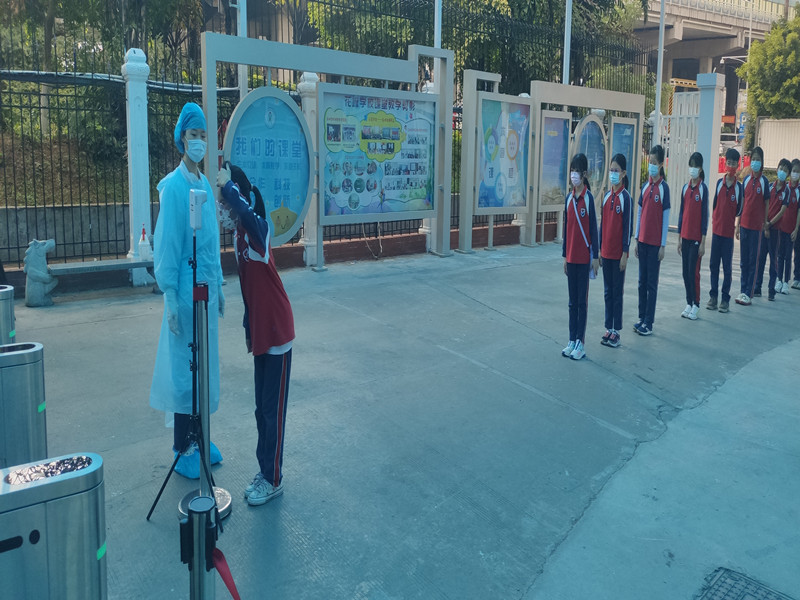 学生在校门时需要通过红外线测温仪,检测正常才能进校。