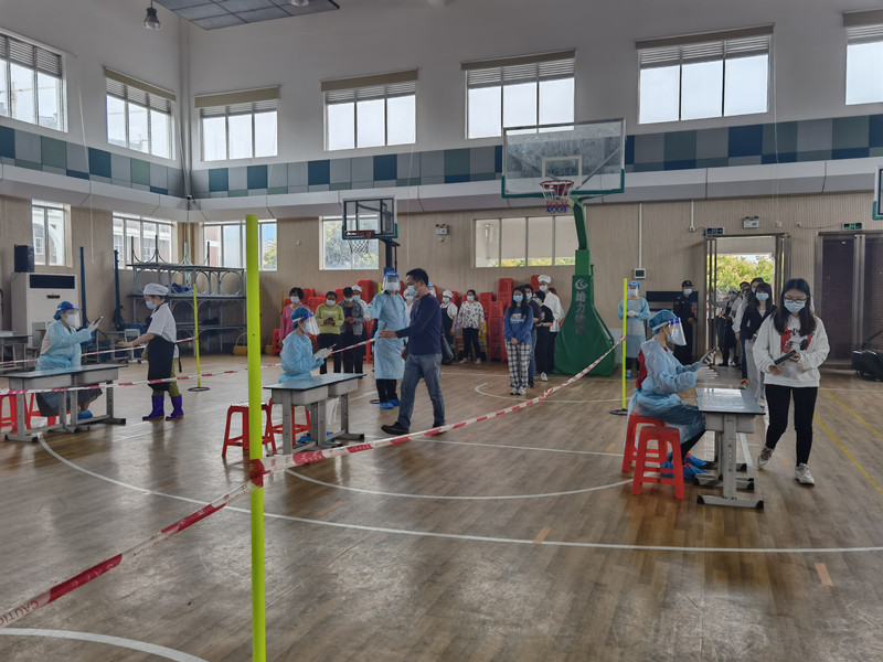 全体师生于我校综合馆进行大规模核酸检测,核酸检测由医院派出专门医护人员到校进行,我校采样现场设有等候区、登记区、采样区等区域,设置了4个通道,全体师生员工全程佩戴口罩,在工作人员的组织引导下安静有序地进行核酸检测。