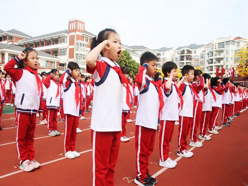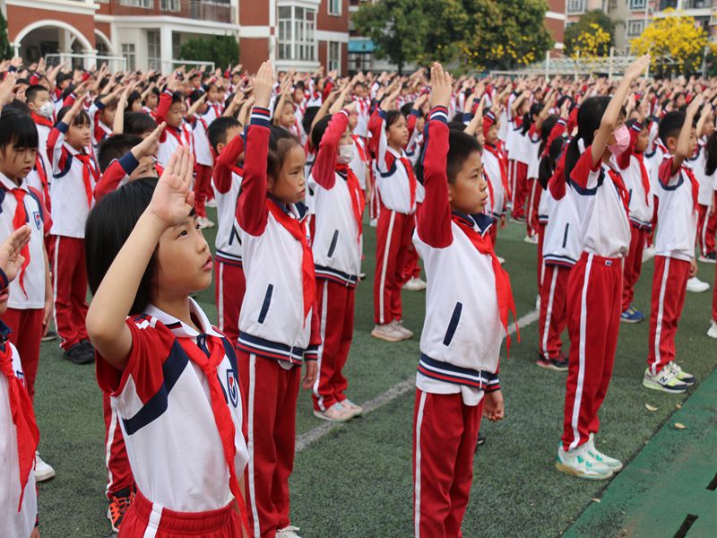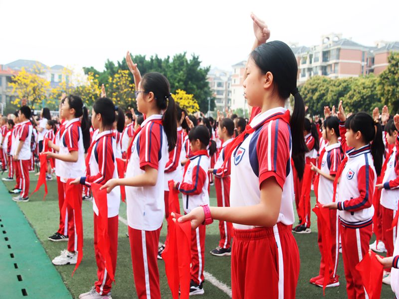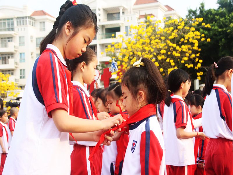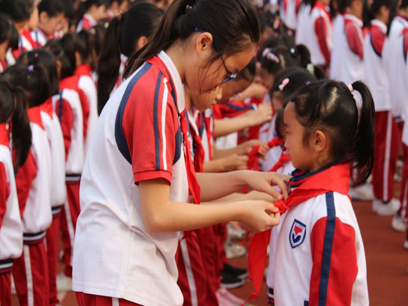 星星火炬,代代相传。五六年级的老队员们为新队员们佩戴红领巾,这是一种荣耀的传递,也是一份责任的嘱托。