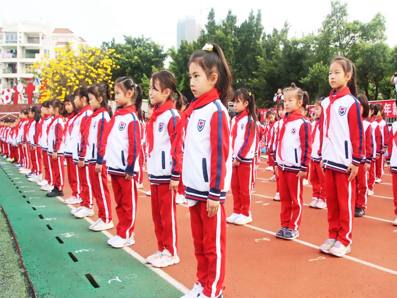 雄壮有力的国歌声奏响,升旗手高高扬起国旗,全体师生行注目礼,唱国歌。伴随着嘹亮的国歌声,入队仪式正式拉开序幕。紧接着,在主持人的宣布下,奏起激昂的《少先队出旗曲》,队旗手迈着有力的步伐入场,火红的队旗高高飘扬,指引我们前进的方向;铿锵而嘹亮的队歌,召唤“红领巾们”做好接班人。一年级小朋友排着整齐的队伍,看着火红的队旗高高飘扬,满怀期待地迎接光荣入队的重要时刻。
