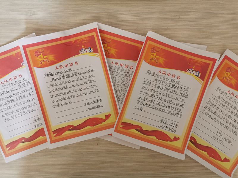 入队前,一年级各班在大队部的组织下,开展了规范而扎实的队前教育。在队前教育中一年级的学生们了解了少先队队史,学习了少先队的有关知识,学唱了队歌,认真书写了《入队申请书》。一张张字迹工整的《入队申请书》饱含着孩子们对少先队的向往,也彰显着孩子们入队的决心。