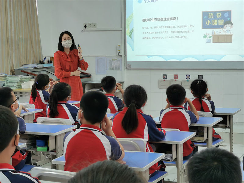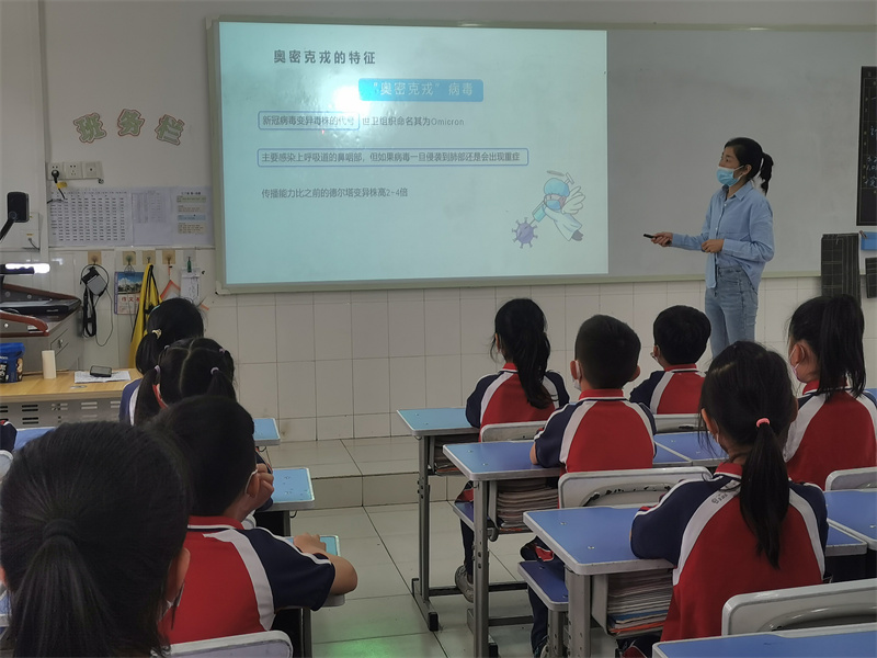 班会上,各班主任通过PPT向学生介绍什么是奥密克戎,以及如何做好个人防护,并教会学生健康防护的知识。
