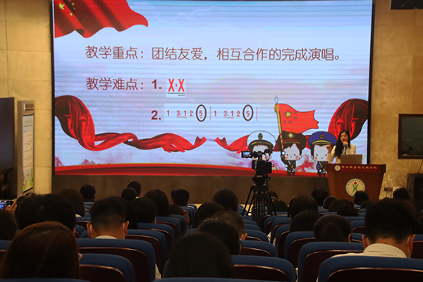 说课是教师口头表述具体课题的教学设想及其理论依据,是授课教师在备课的基础上,讲述自己的教学设计。说课是为了达到互相交流,共同提高的目的,它能够引导教师进一步去思考,从根本上提高教师的备课质量。为了积极发挥学科带头人的示范作用,2022年3月21日晚,音乐组彭金婷老师在学术报告厅为大家献上了一堂精彩的说课展示———《共产儿童团歌》。