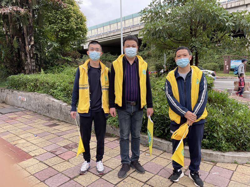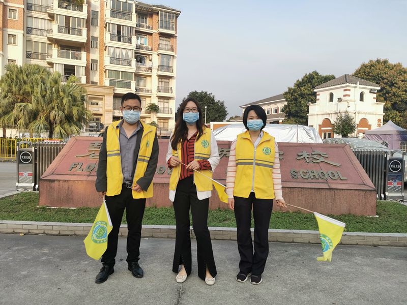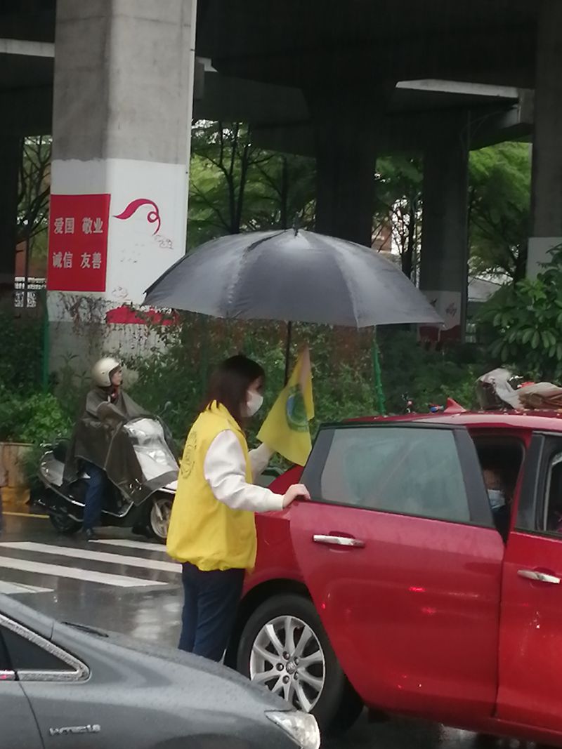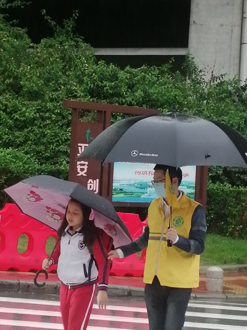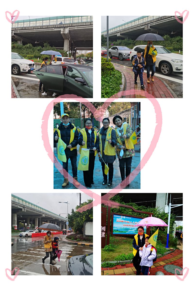 他们为了确保学生上学高峰时段安全,维护机动车辆有序行驶和停放。无论是晴天,还是刮风下雨,他们每天早上7:10都准时出现在花城学校门口的马路上。他们维持秩序,用实际行动为上学路上的孩子们保驾护航。