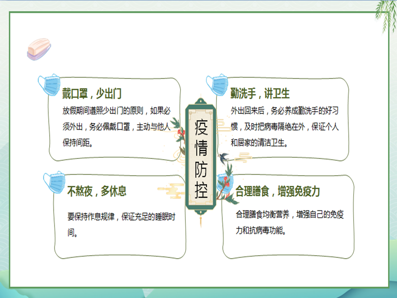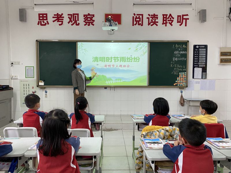 4月2日第七节课,各班班主任组织学生开展以“清明时节雨纷纷”为主题的班会活动。班会活动内容包括了“节日渊源”、“ 地方习俗”、“ 文明祭祀”等。同时,针对现今疫情形势,班主任们在课上也进行了疫情防控安全教育,倡导学生放假期间少出门,戴口罩;勤洗手,讲卫生;不熬夜,多休息;合理膳食,增强免疫力。