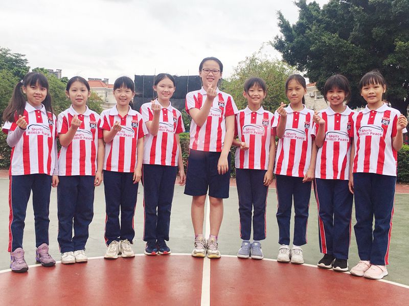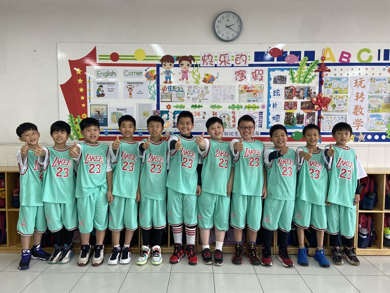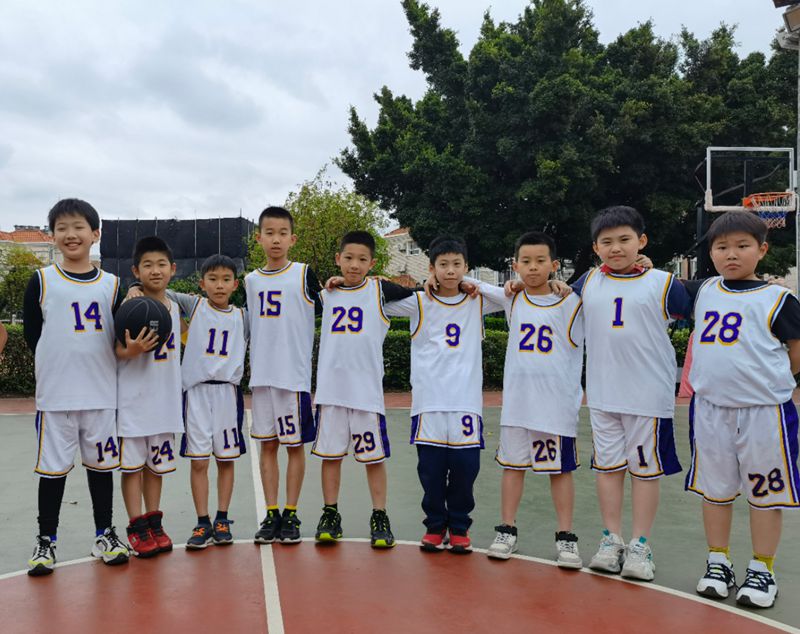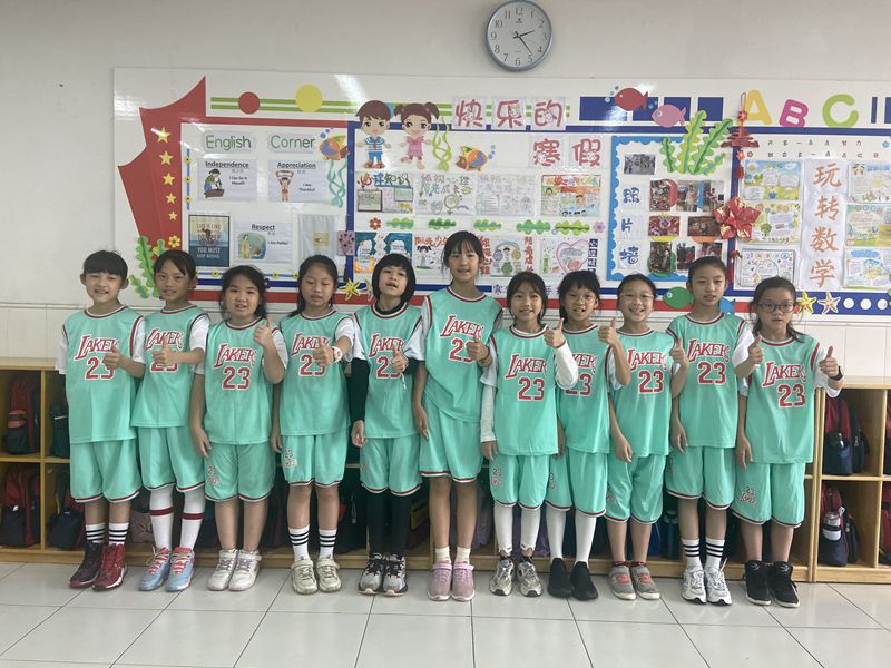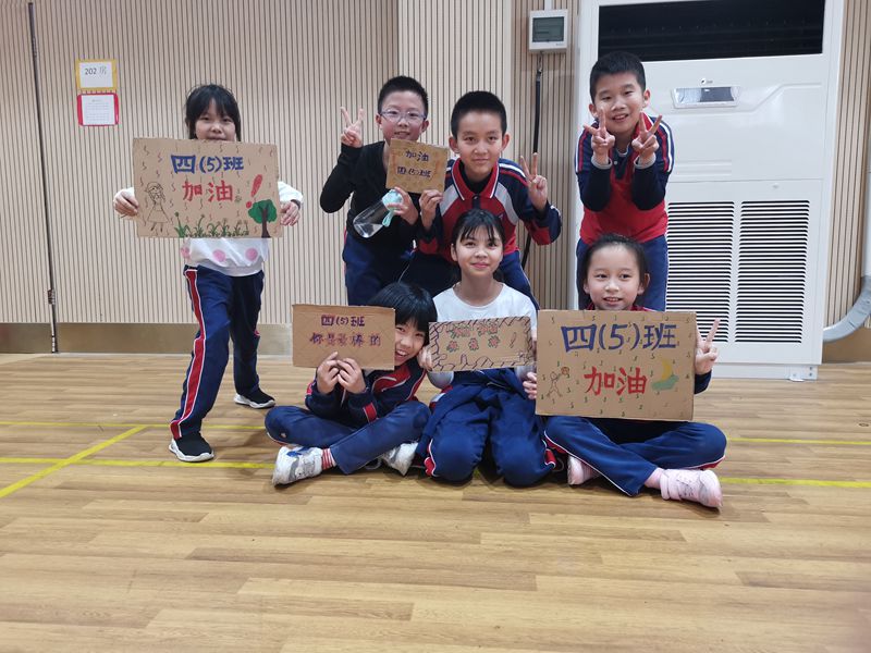 四(5)班同学说:“我们班的口号是——五班加油!五班必胜!团结一心,不怕困难!冲鸭!我们有最靓的队长,我们的队员都能全力以赴,我们学到了很多篮球技巧,积累了比赛经验,真的很nice!”