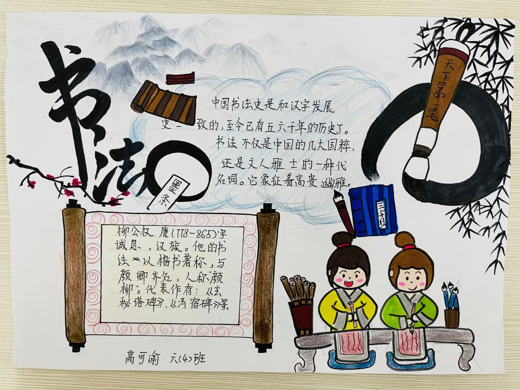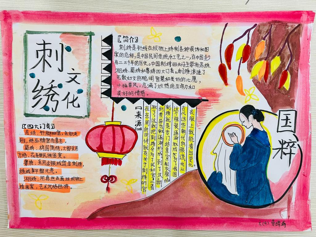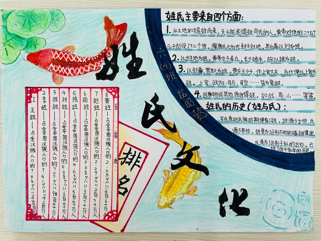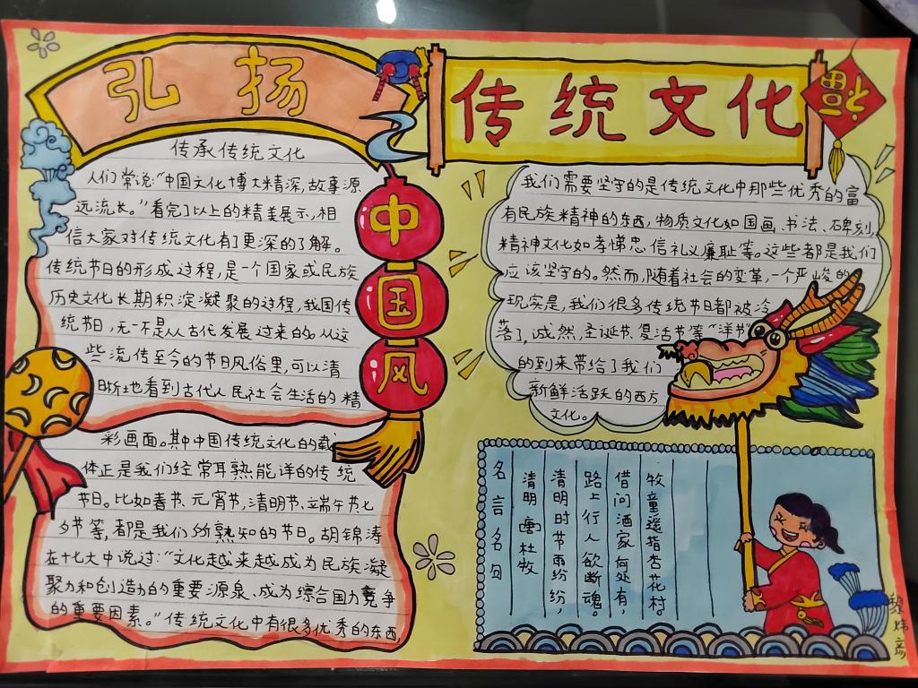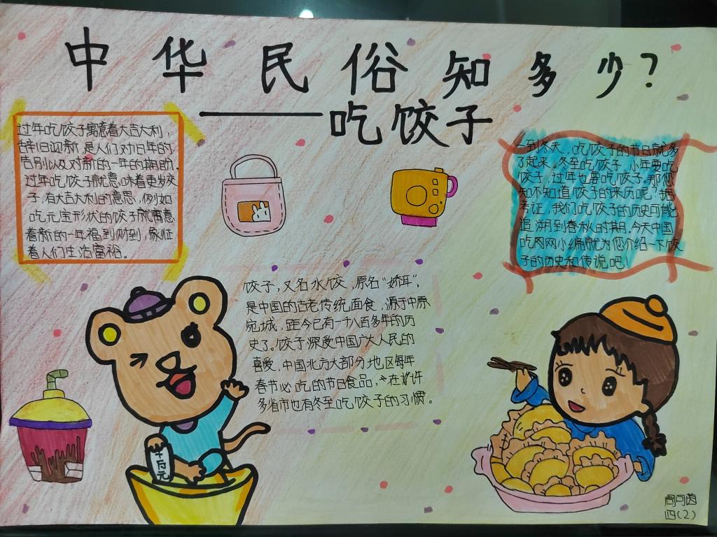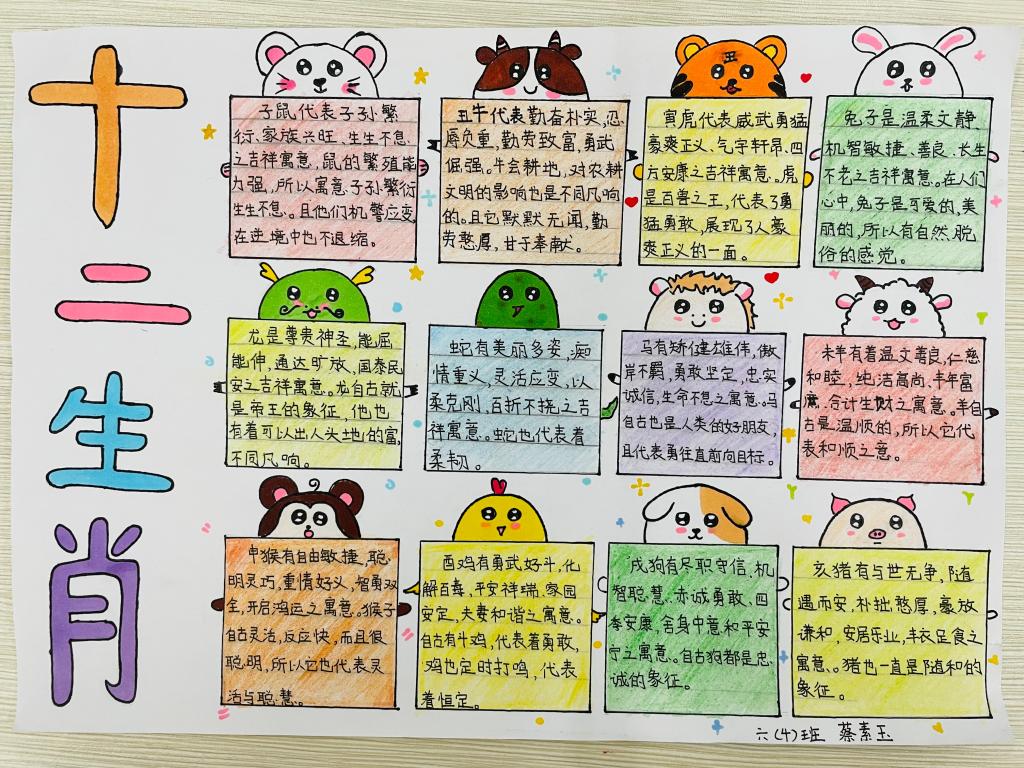 学生们通过资料汇编、风土人情介绍等创作了手抄报。手抄报设计形式多样、内容丰富、图文并茂,设计内容有关于“十二生肖”“筷子文化”“姓氏文化”“二十四节气”“餐桌礼仪”“艺术传承”等。版式上排版合理、色彩搭配协调,充分发挥了学生的自主创新能力。