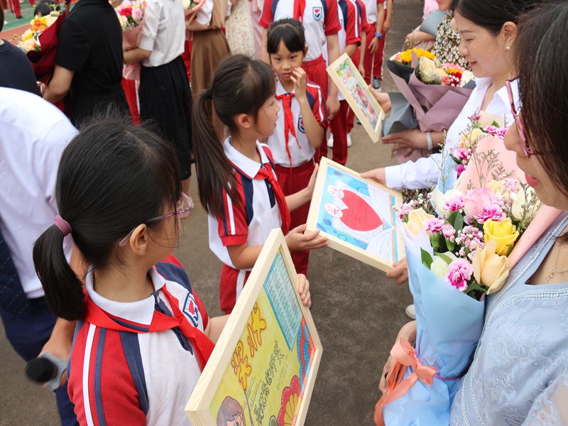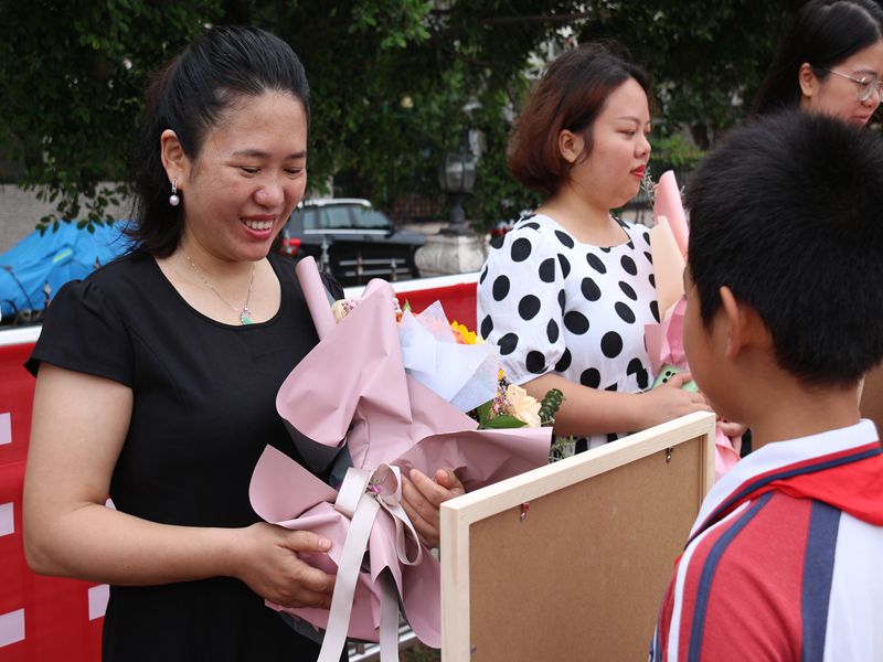 最后,各年级的学生代表与班主任们上台,学生代表们向班主任敬礼致谢、送上美丽的鲜花和设计精美的绘画奖状,该环节将本次开幕式推向最高潮。