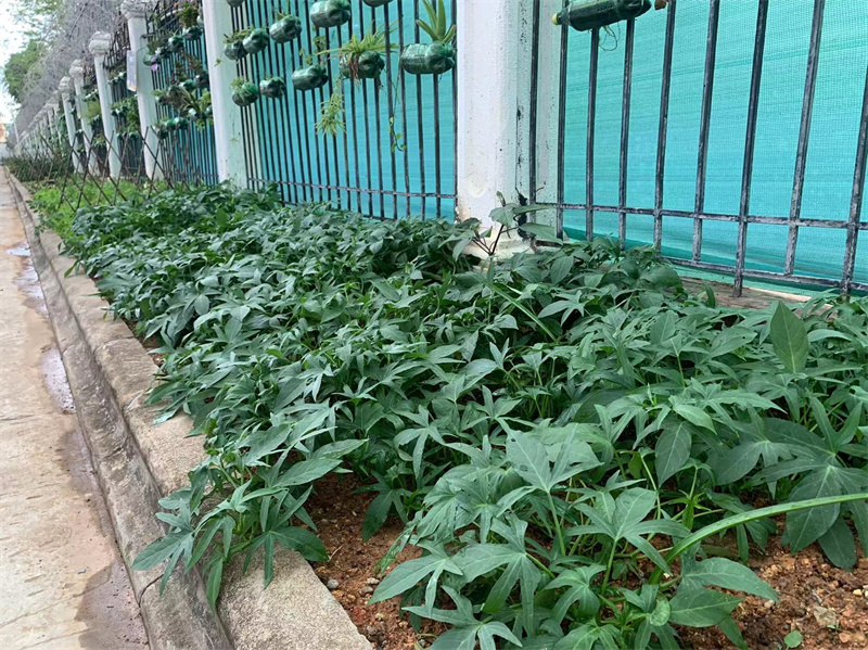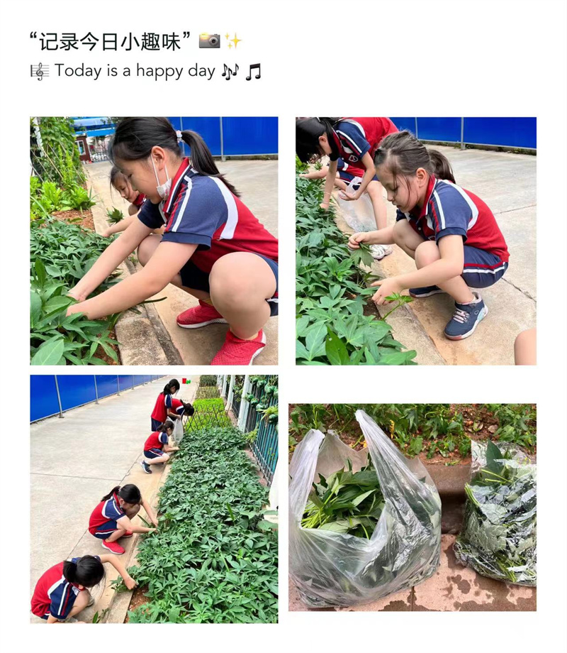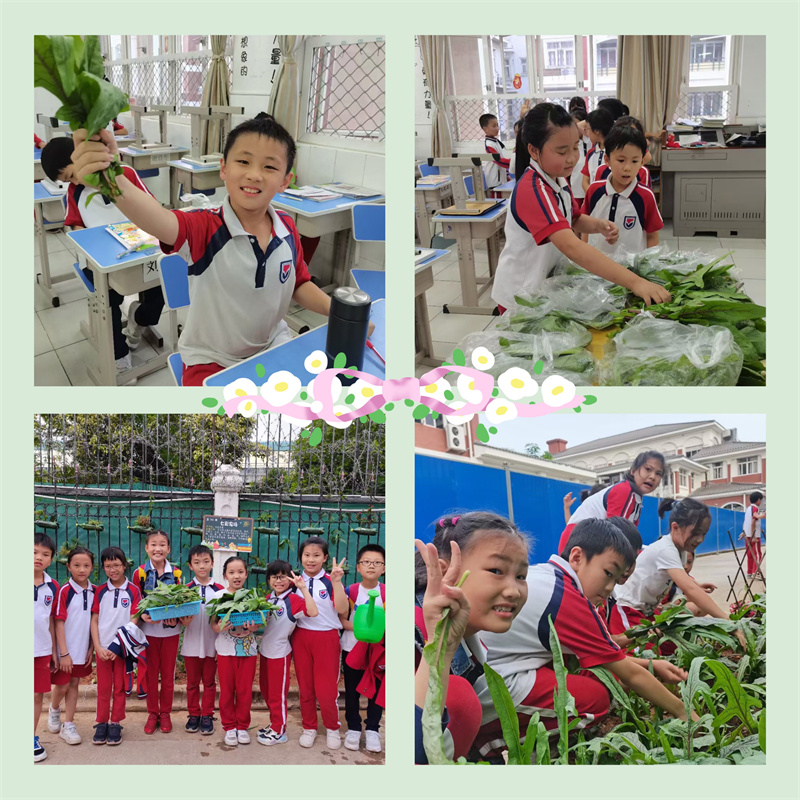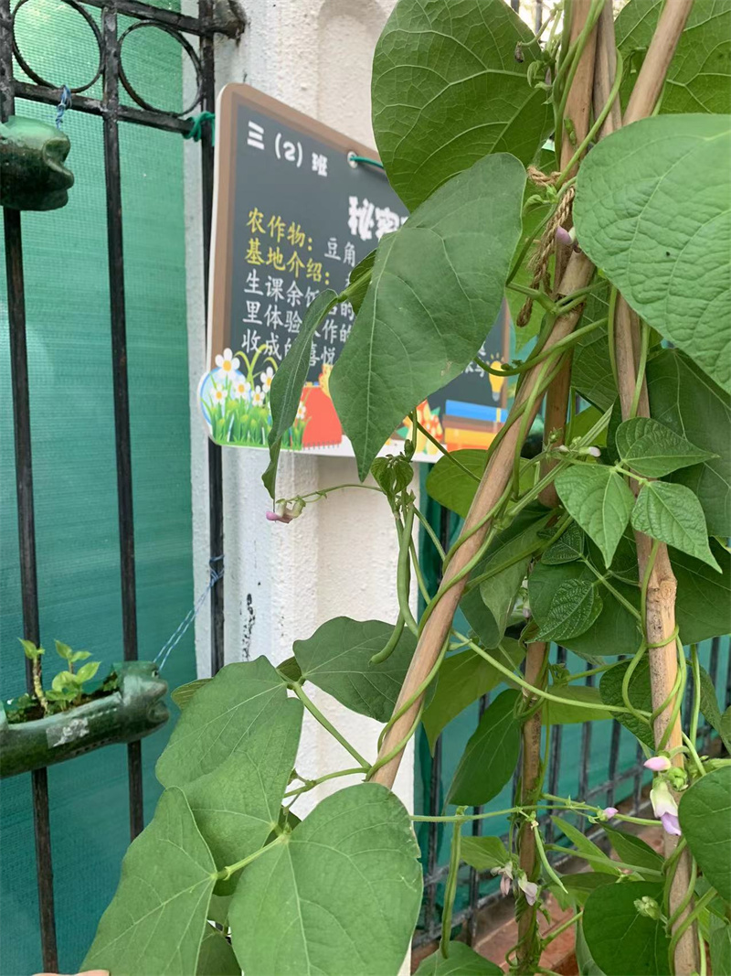一个多月过去了,各班小菜园纷纷换上新装,菜苗宝宝们大变样。四季豆已经开花结挂豆了;辣椒苗已经拔高了一大截;番薯叶也长得茂密成片;葱苗已经随宵夜进入同学们的肚子了。