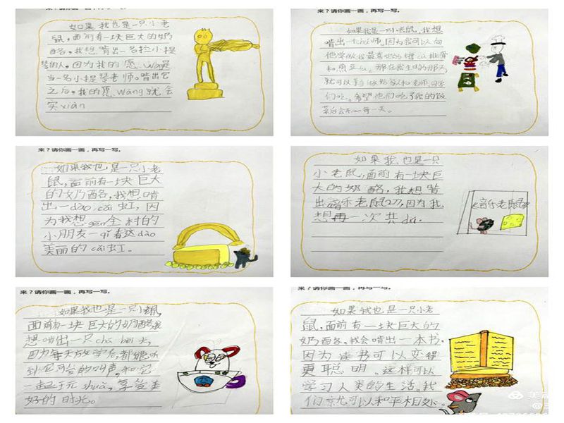 看!5月11日下午,一年级小朋友们在课堂上尽情描绘着自己的作品,用充满智慧的妙笔记录着书中的精彩画面。多心灵手巧的孩子们啊,多丰富多彩的作品啊!孩子们通过一幅幅稚嫩而充满想象力的画,展现着自己对书中内容的理解和体会。书中的人物在小朋友的奇思妙想下变得妙趣横生!大家在轻松愉快的氛围中欣赏写绘作品,遨游在奇思妙想的童趣世界里,享受着书籍带来的与众不同的美好和幸福!