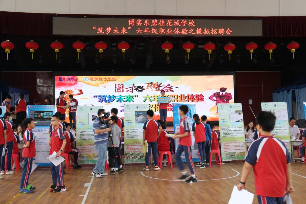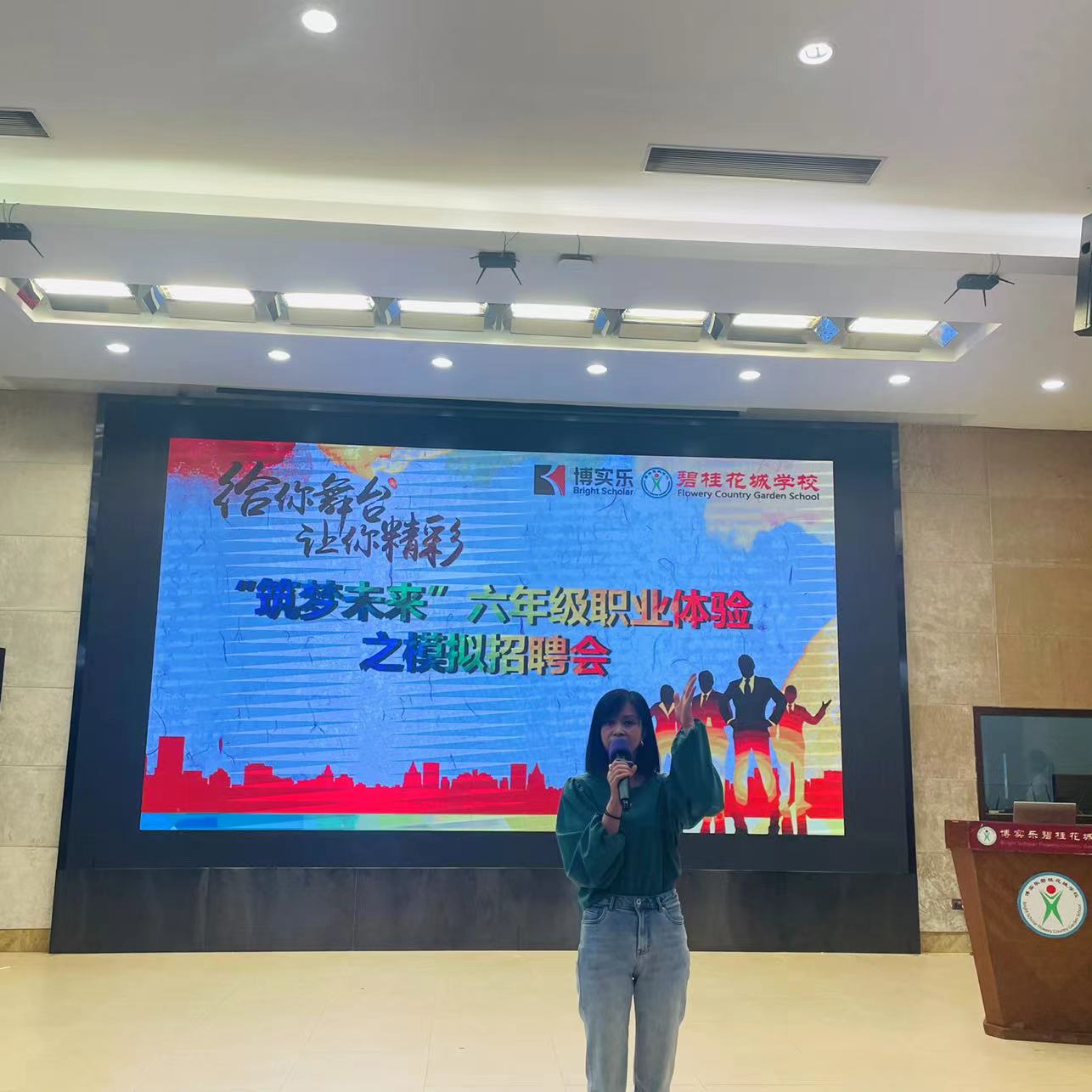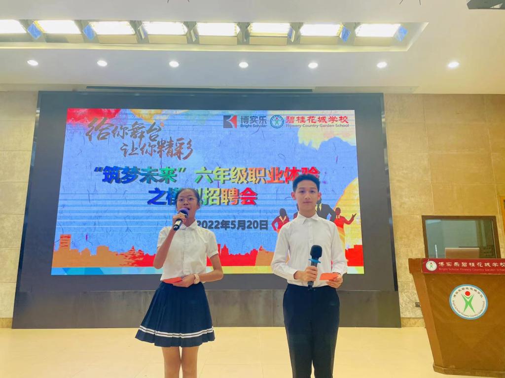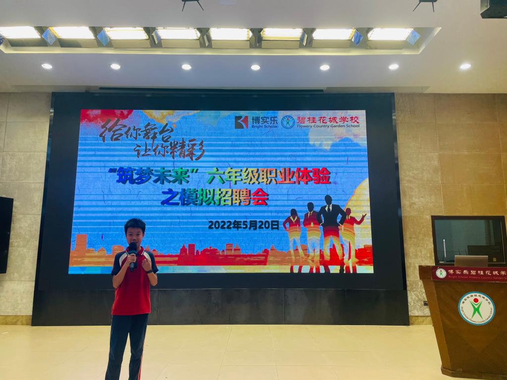 为了深入开展生涯规划教育课程,提升同学们的就业意识,让同学们通过职场体验,检验与梳理自身的兴趣、能力,尽早规划未来长远发展道路,为同学们提供一个展示自我、挑战自我的机会。2022年5月20日,碧桂花城学校召开了第二届“筑梦未来”职业体验之模拟招聘会。