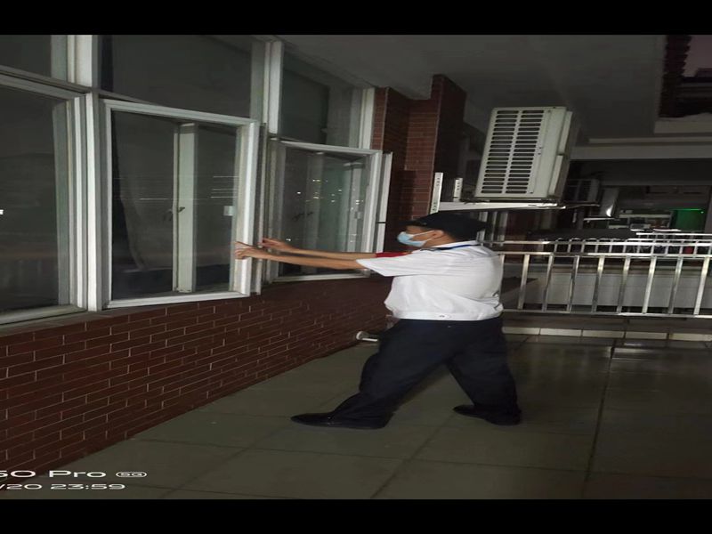 晚上,大家都离开了学校,校园也回归了平静,可是学校的保安依然在忙碌着:巡查教学楼和宿舍楼的物品摆放,检查每个教室的电器是否关闭,查看各功能室门窗有无关好等,这是为了预防突发天气,避免造成不必要的公共财产损失。