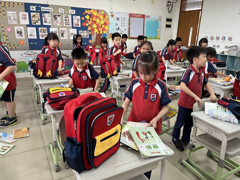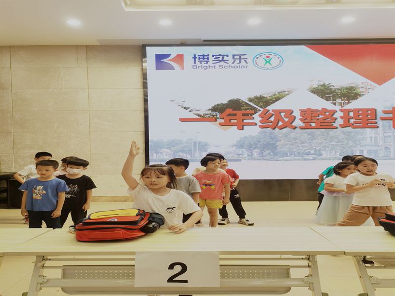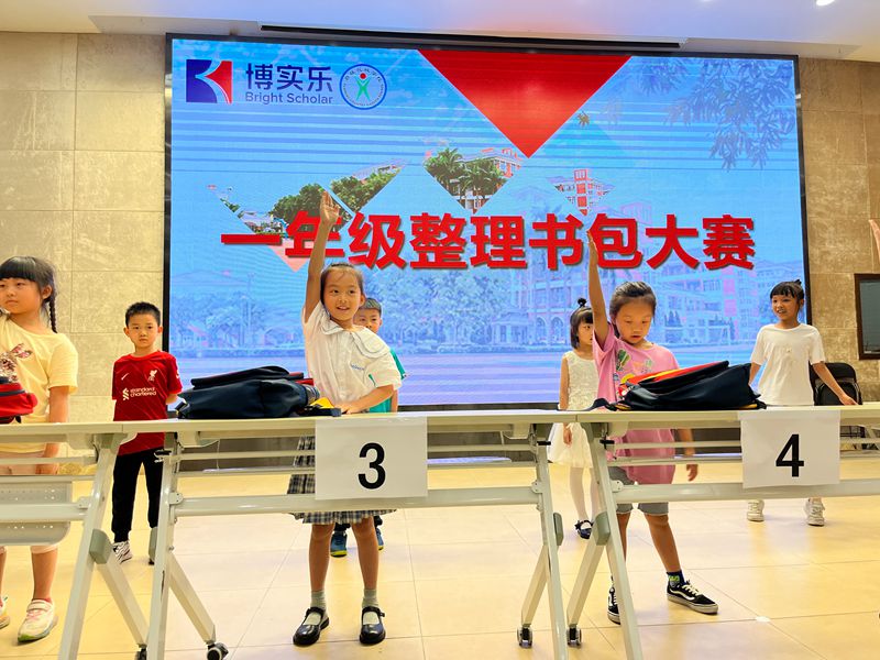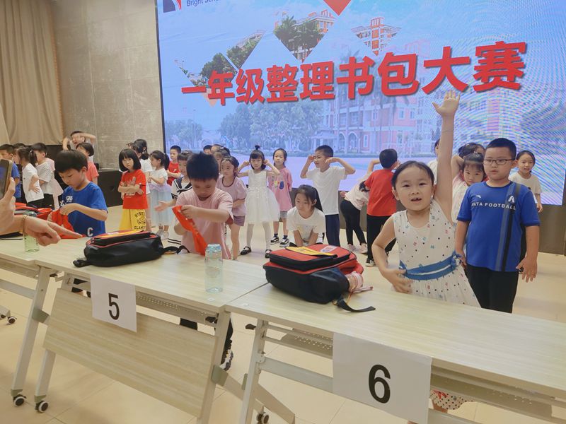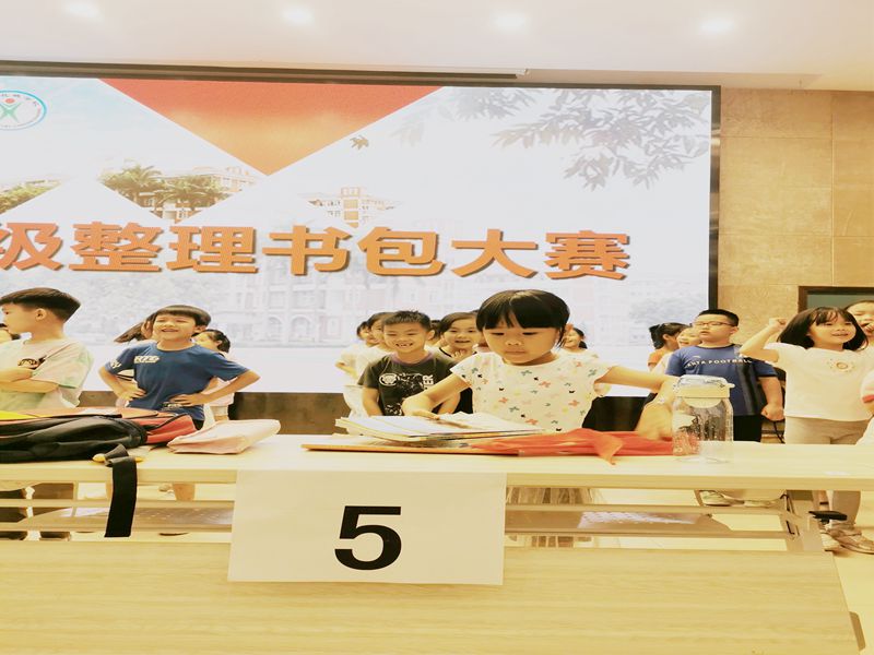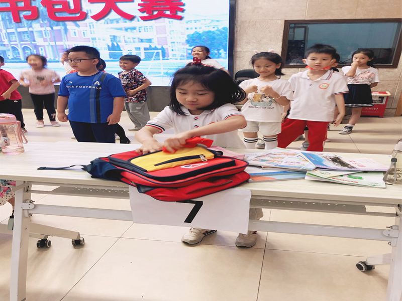 比赛过程中孩子们积极参与,热情高涨,他们有的是按照顺序先整理好然后再一起装进书包,有的是一本一本的放进书包,这样就稍慢一点,但都能在规定的时间里把书包整理整齐,拉好拉链,并举手示意,裁判员检查后评分。