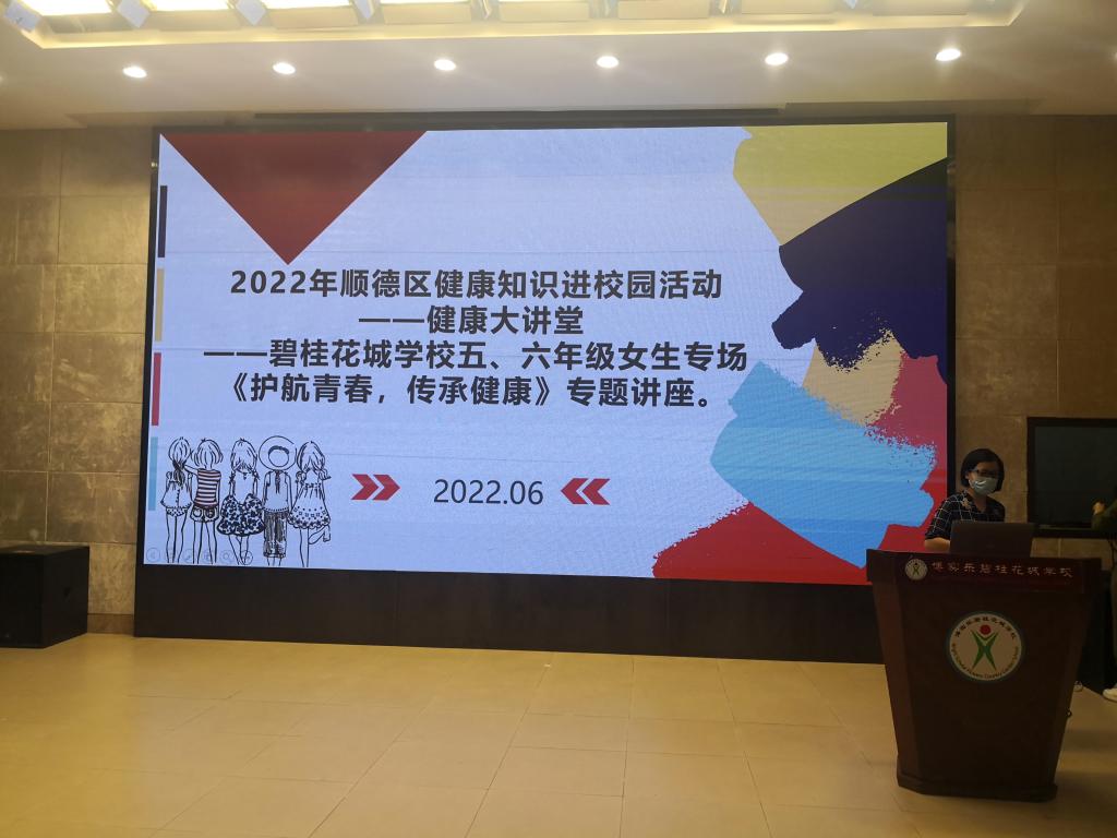 青春期是人生最美好的年华,是身心快速发展的重要阶段,同时也是人生中易困惑的关键时期。正确、及时的青春期教育对已经进入或即将进入青春期的孩子来说极为重要。为提高五六年级男女生对青春期健康知识的认知和提高自我保护能力。2022年6月17日下午,碧桂花城学校开展了佛山市顺德区“健康教育进校园”巡讲活动,佛山市顺德区妇幼保健院蓝医生为我校五、六年级的女生带来题为《护航青春、传承健康》的专题讲座,男生则在教室观看青春期健康教育视频。本次活动由德育处郭园主任主持。