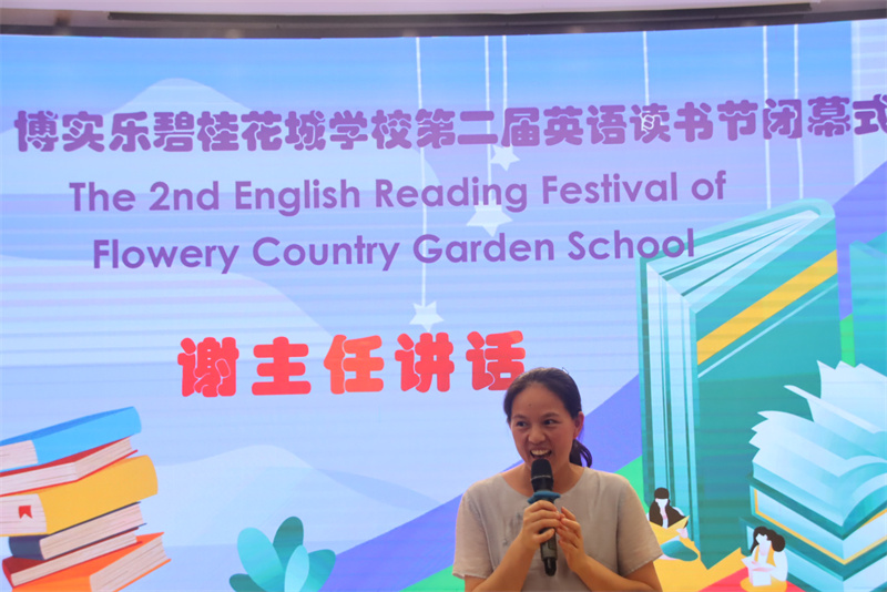 谢梅嫦主任在会上发表讲话。她充分肯定了学校师生在本届英语读书节活动中的表现,鼓励师生要保持多读书、读好书、会读书的习惯。她殷切地希望英语阅读能继续与同学们为伴,同学们能在以后的英语学习中每一天都有收获,每一天都有进步,每一天都有成长!