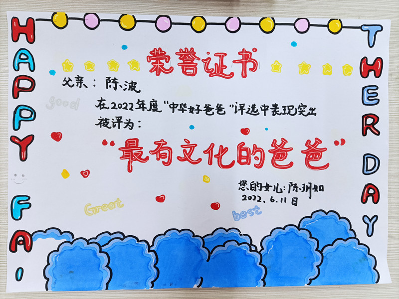 在父亲节这个美好的日子里,五六年级同学通过送爸爸一张奖状和给爸爸写一封信等方式表达着对父亲浓浓的爱。