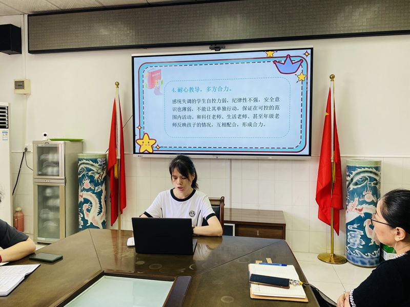 莫老师首先介绍“感统失调”的含义,结合实际,主要从“听觉感不良”,“ 视觉感不良”,“ 前庭平衡功能失常”,“ 触觉过分敏感”等方面进行阐述感统失调的表现,再有针对性地展开具体做法,如:及时与家长进行沟通,早日干预;放平心态,降低对学生的期望值;保护隐私,尊重学生;耐心教导,与科任老师、生活老师、甚至年级老师形成合力帮助学生。