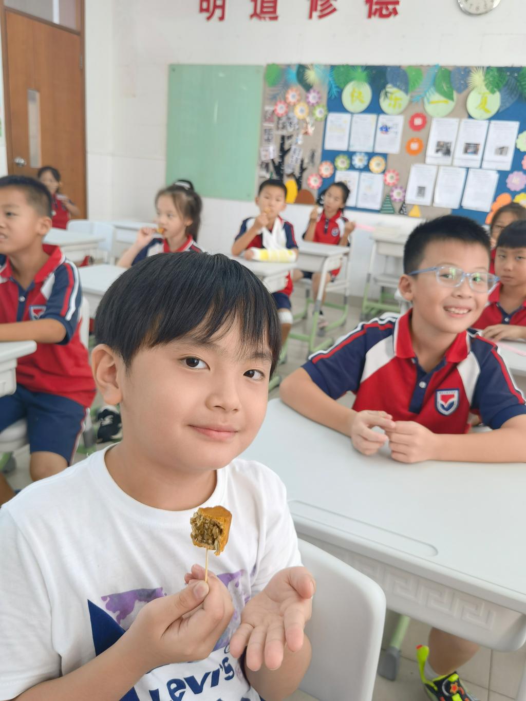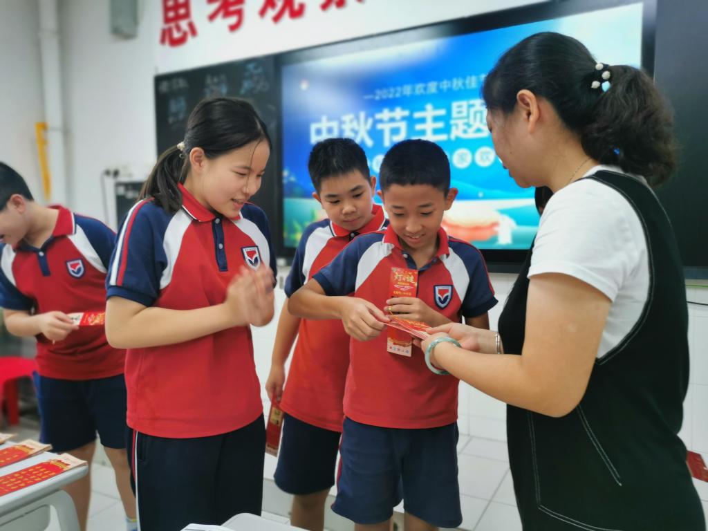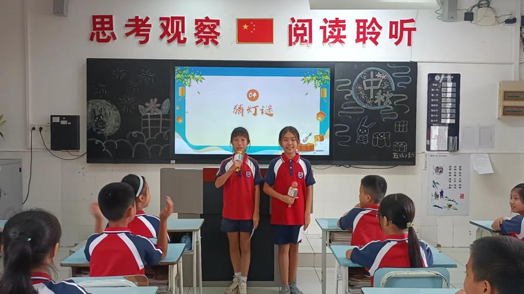 各班举行“迎中秋•共团圆”主题班会,采用唱中秋童谣、朗诵有关诗文、讲故事、猜灯谜、做月饼、画中秋等方式喜迎中秋佳节,延续中华文脉。