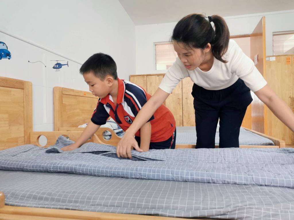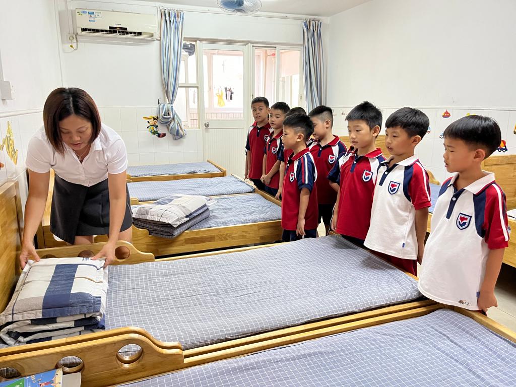 学习完之后,就该学生们自己实际操作,学习如何折叠好被子了。生活老师非常耐心、认真负责地在指导每一位学生学习折叠被子。