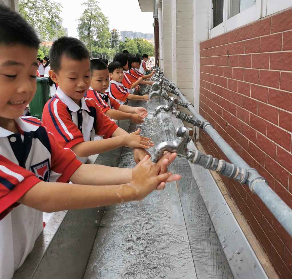 生活老师引导学生们有序排队洗手,为就餐做准备。