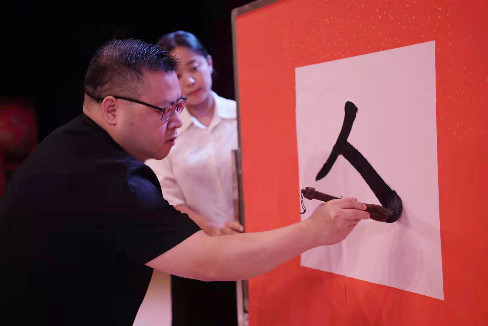 开笔写“人”,教导孩子们要学做一个堂堂正正的中国人。一年级新生在张峰老师的指导下书写简单而意义深远的“人”字,完成后,学生们将书写的作品自豪地举起,家长们报以热烈的掌声。