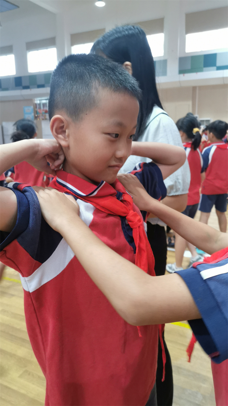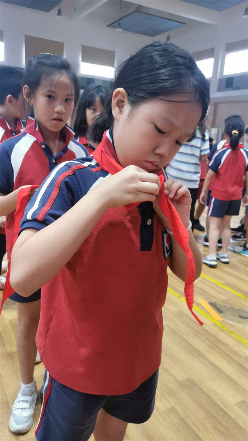 红领巾是队旗的一角,是革命先烈的鲜血染成的。全世界只有中国的少年儿童能佩戴红领巾,这是特殊的标志,更是特殊的荣耀。2022年9月30日下午,花城学校三年级的学生们精神抖擞,将红领巾铺平,严阵以待,随时准备着投入系红领巾比赛中。