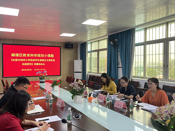 2022年11月16日上午,佛山市顺德区教育科学规划小课题——“红歌对培养小学低段学生爱国主义情怀的实践研究”结题报告会在潭村小学会议室召开。出席会议的领导有陈村镇教育办的李学英副主任和陈村镇青云小学甘爱仪校长,陈村镇中心小学植丽娟主任,以及碧桂花城学校教科处王在和主任以及课题主持人彭金婷老师和课题组的成员等共10余人参加了结题报告会。