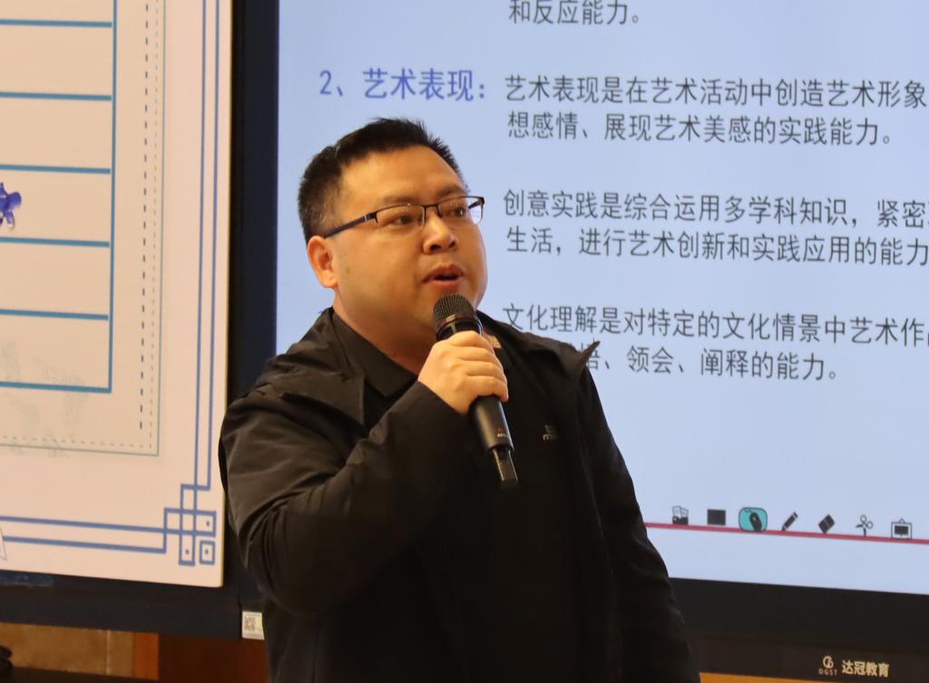 展示课结束后,学科带头人张峰老师结合新课标对本节课进行了精辟的现场评课。从审美感知到艺术表现,从创意实践到文化理解,张峰老师从艺术课程的核心素养四个方面细致讲述。学生在课堂中的艺术实践离不开欣赏、表现、创造和联系、融合。学生通过对青花瓷的历史文化的学习,感受青花瓷的造型与纹饰之美。学生结合青花瓷纹饰的临摹,联系生活进行文创产品的设计,学生对青花瓷纹饰在生活中的运用有了更加深刻的理解。本节课紧密围绕艺术课程标准,设计、组织教学,培养了学生的小组合作精神和自主探究学习能力,展现了中国优秀传统文化青花瓷的独特魅力,增强了学生对我国优秀传统文化的认同感和自豪感。