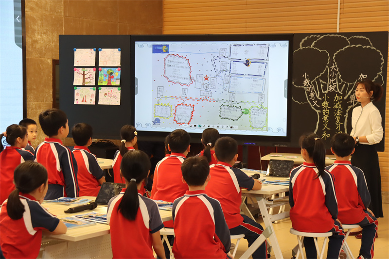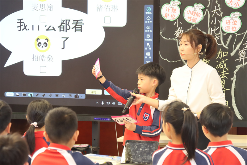 课堂展示活动中,陈淑婷老师带来的是一节智慧课堂《小数的意义和加减法复习课》的展示课。她的课堂设计了“知识点回顾”“快乐寻宝”和“课堂小结”三个环节,利用孩子们课前绘制的思维导图引入回顾所学知识点,将第一单元中学生需要注意的知识点板书在知识树上,再让学生跟随海盗寻宝的闯关游戏巧妙地将智慧课堂抽选、抢答、计时、微课录制、屏幕分享和学习平板等各种高科技功能融入本节课的教学中,让学生在“学中玩、玩中学”中顺利突破了本节课的重难点。
