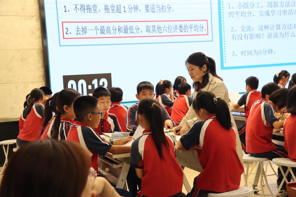 朱小夏老师从观看一则“1.3米免票线”的实时新闻视频,让学生了解平均数可以帮助我们确定生活中的一些评价标准。接下来,朱老师同样也是通过歌手大赛的分数排名问题,引导学生思考极端数据对于平均数的影响。学生在具体情境下有关平均数的练习中,进一步了解平均数的意义。