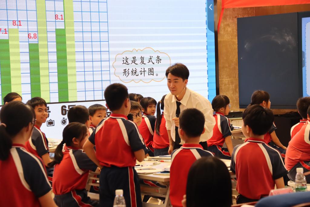 刘刚老师执教的内容是《复式条形统计图》。上课伊始,刘老师先让同学们观看一则精彩的投篮视频,随之引出问题“单手投篮远还是双手投篮远?”,从而激发学生思考,进入课堂学习。学生在刘老师的引导下,经历了复式统计图产生的过程。学生在认识、填写、分析数据的过程中,进一步了解统计方法,培养分析、推断的能力,提高数据意识。