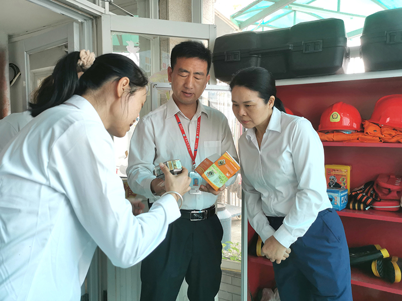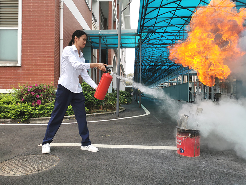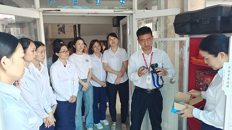 首先,郝队长介绍了干粉灭火器与泡沫灭火器的适用地点。干粉灭火器安置于教室、宿舍楼等地方,泡沫灭火器主要安放在电脑室。郝队长重点讲解了灭火器的原理、灭火器的检测、灭火器的操作方法及注意事项。为了让生活老师更好地掌握灭火器的使用方法,郝队长还逐一指导老师们进行干粉灭火器的实际操作。老师们轮流上阵,迅速掌握了干粉灭火器的使用方法。