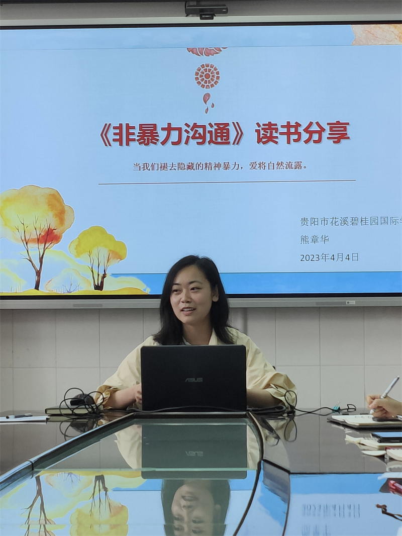 花溪碧桂园国际学校的熊章华老师推荐的是马歇尔·卢森堡《非暴力沟通》。马歇尔·卢森堡是美国威斯康星大学临床心理学博士。通过熊老师的介绍,老师们知道了什么是非暴力?非暴力沟通有哪些好处?暴力沟通和非暴力沟通会分别带来怎样的结果。俗话说:好言一句三冬暖,恶语伤人六月寒。语言的力量,既可以如春日暖阳般让人满怀热情,也可能像疾风暴雨一样给人打击,关键在于我们如何去运用。
