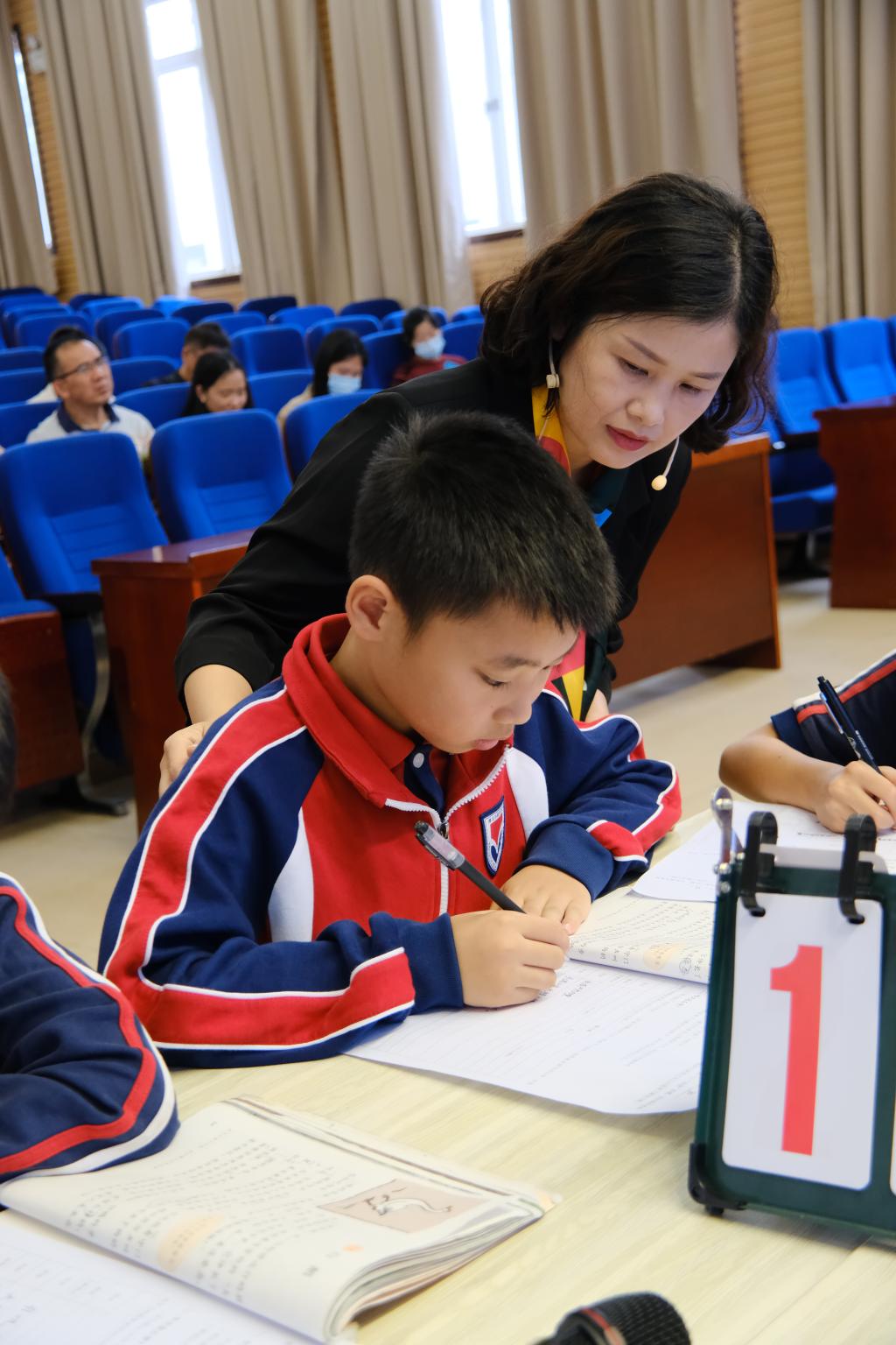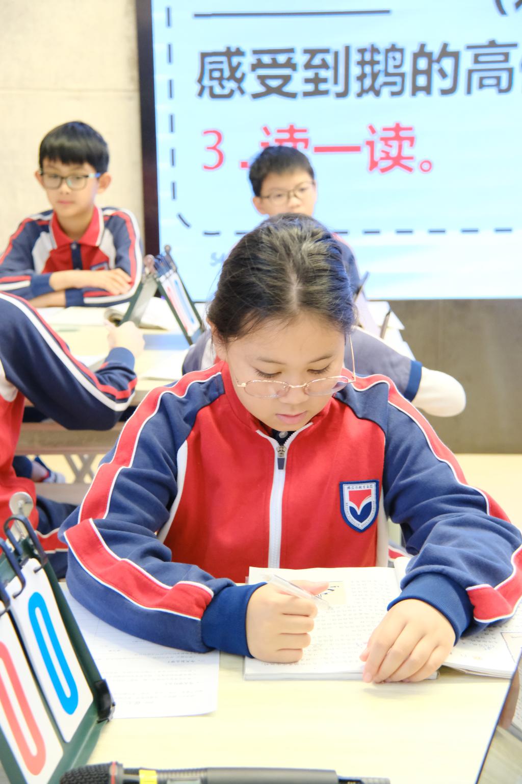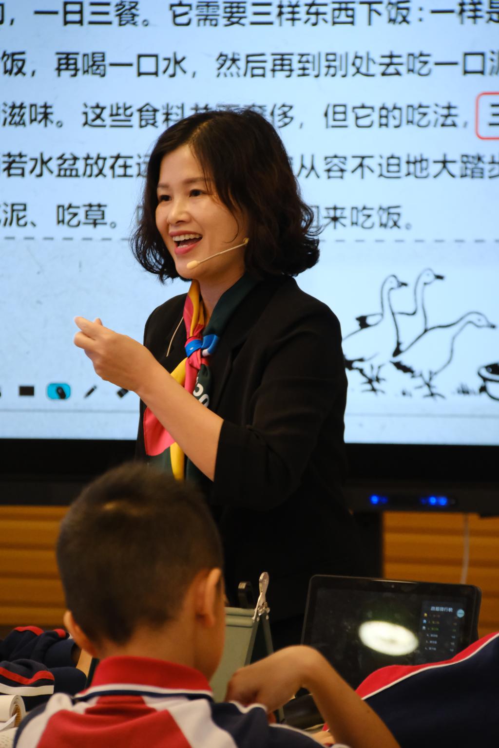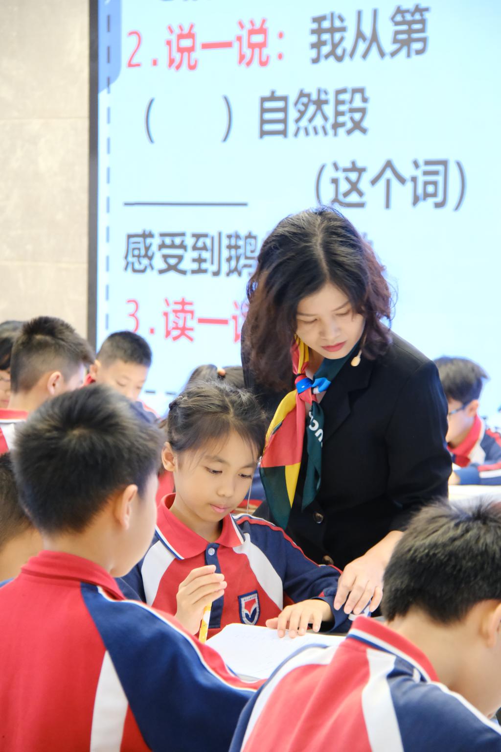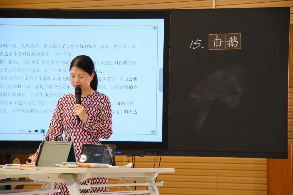 紧接着,花城学校语文学科带头人黄晓芸老师,给片区老师们展示课例——《白鹅》。黄老师整堂课以文学阅读与创意表达任务群为实践活动,聚焦核心素养,围绕鹅的“叫声、步态、吃相”三个方面,带领学生领悟白鹅的高傲,感受明贬实褒写法的妙处,体会作者对白鹅的喜爱之情。并借助阅读链接,指导学生方法实践,用对比阅读的方式提升学生的思维。这堂课不仅展示了黄老师深厚的教学功底,也展示了黄老师在《义务教育语文课程标准(2022版)》教学实践中的探索。根据当前所教内容,构建语文学习任务群,从学生语文生活实际出发,创设丰富多样的学习情境,设计了富有阶梯性的学习任务,激发了学生的好奇心、想象力、求知欲,促进学生自主、合作、探究学习。借助信息化手段激发学生兴趣,分层教学,满足学生个性化学习的需求,开展多元评价,锻炼学生综合能力。整节课精心准备、深挖教材、巧妙设计,把夯实学生基础与培养学生创新思维、创意表达相融合,展示了大单元教学的设计理念,为片区老师呈现出一堂高水平的大单元教学示范课。