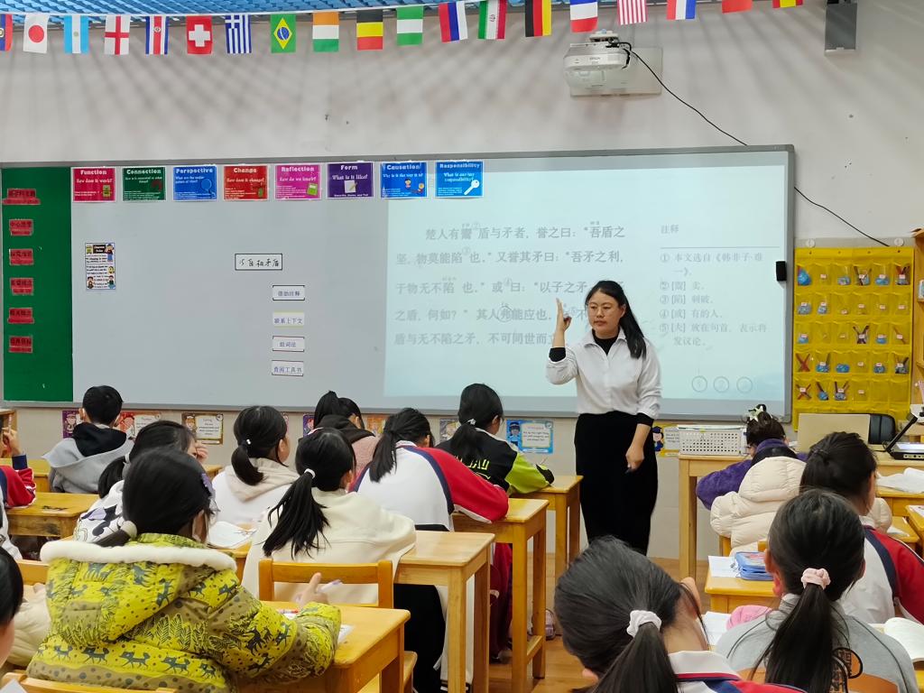 胡丽燕老师展示课的课题是《自相矛盾》。胡老师坚持以学生读、讲为主,在读中感悟,充分调动学生的积极性。并以猜成语游戏引入课堂,课堂伊始为学生提供学习方法、建立知识框架,指导学生熟读课文、疏通文意后,提供思维导图帮助他们小组合作进行学习,体现“自主学习”“发现学习”“合作学习”的理念。