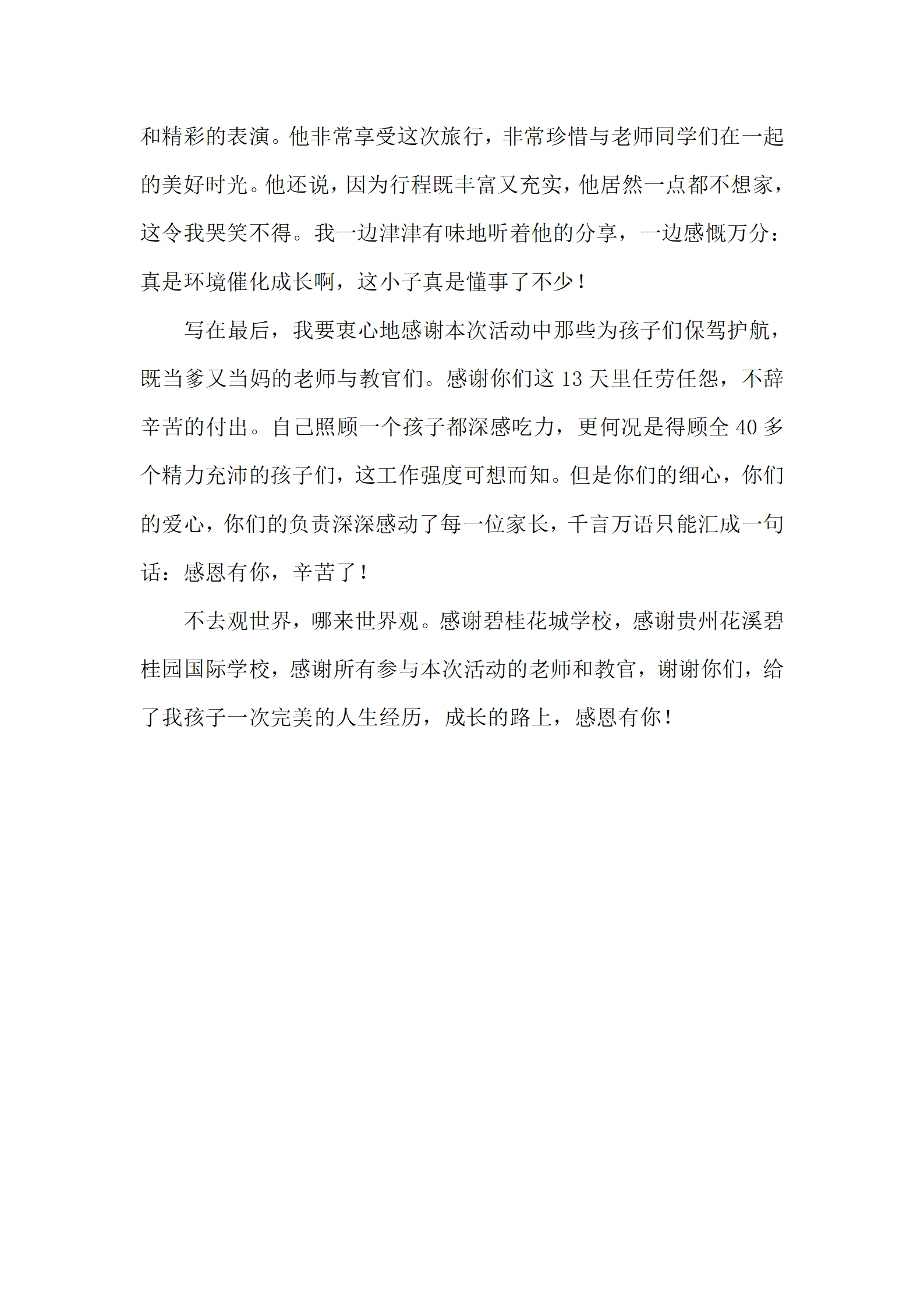 研学增见识,实践促成长。集体旅行、集中食宿的方式,让孩子们走出了校园,拓展了视野,丰富了知识,感受了别样的民族风情,加深了与自然和文化的亲近感,同时这是一次温暖而幸福的旅行,但这仅仅只是一个美好的开始。碧桂花城学校努力为每一个孩子搭建健康、多元、互动、快乐的平台,让每个生命获得完整地成长体验。成长路上,有你,有我,有我们大家!