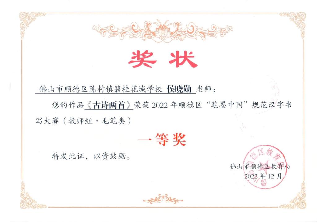 ●侯晓勋老师荣获2022年顺德区“笔墨中国”规范汉字书写大赛教师组毛笔一等奖