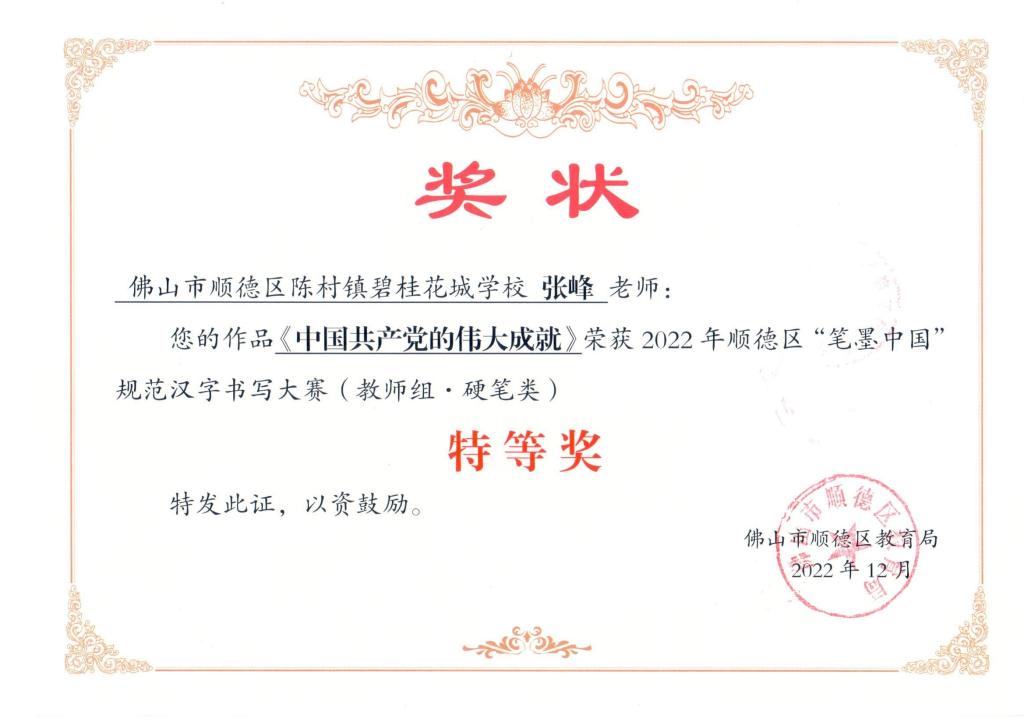 ●张峰老师荣获2022年顺德区“笔墨中国”规范汉字书写大赛教师组硬笔特等奖
