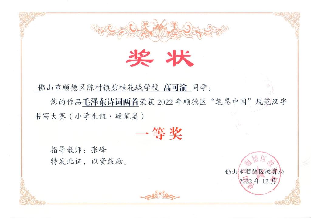 ●高可渝同学荣获2022年顺德区“笔墨中国”规范汉字书写大赛学生组硬笔一等奖