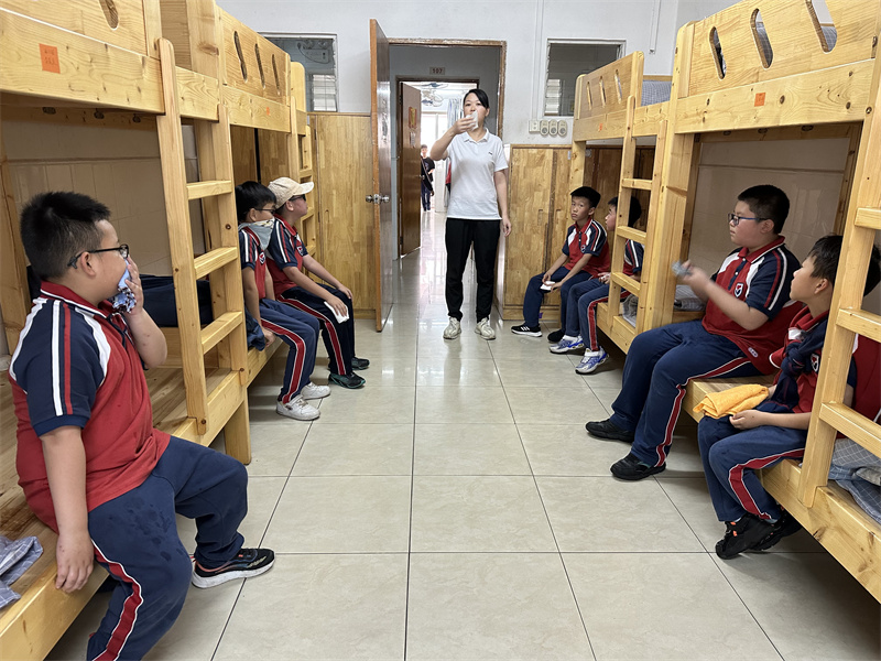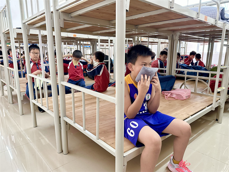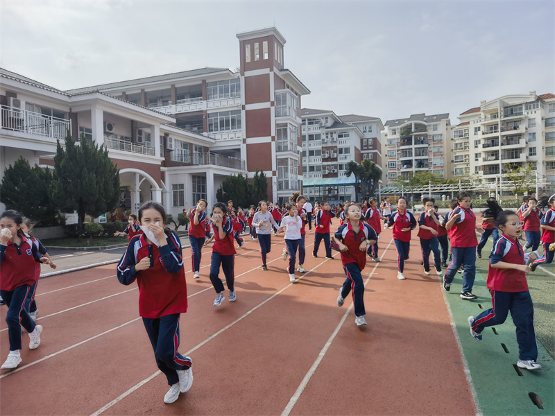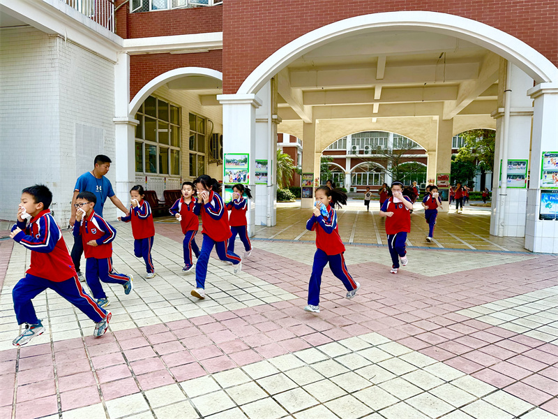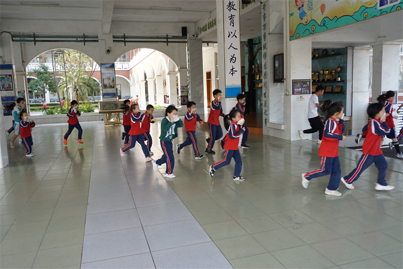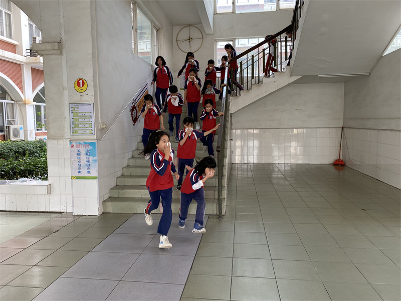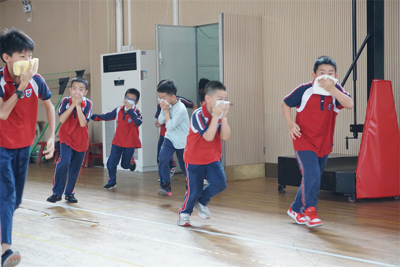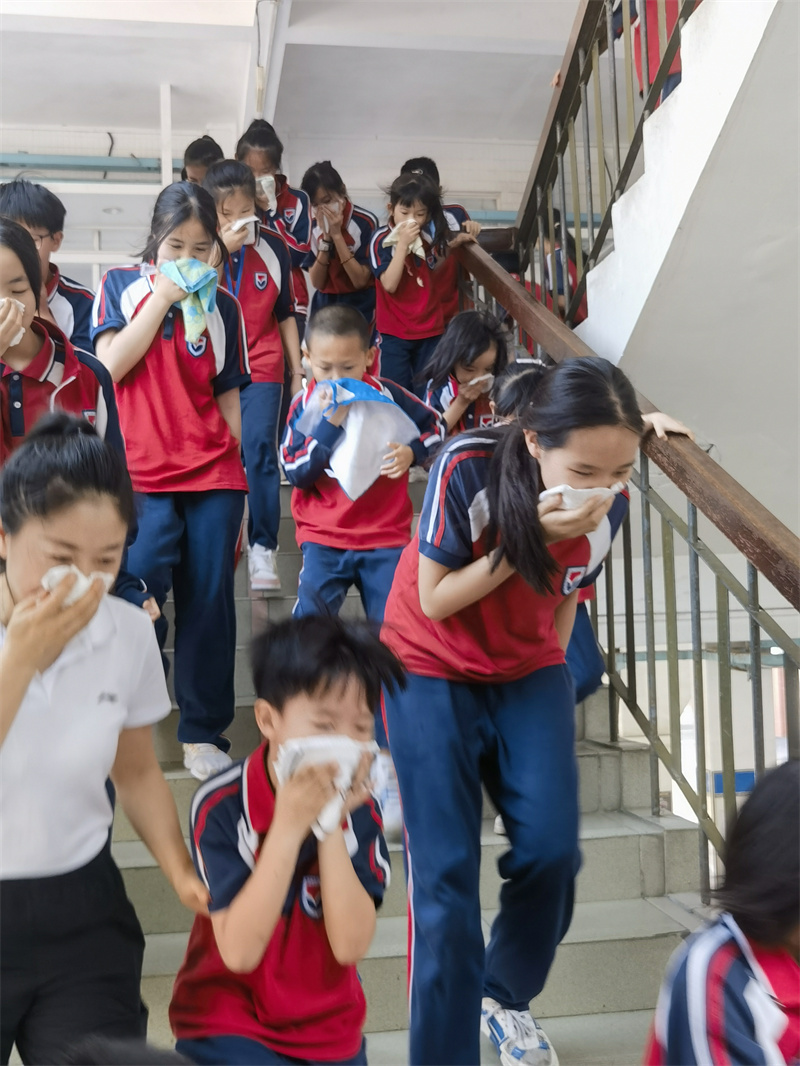 15:37,随着紧急疏散警报响起,各个房间的学生在老师的指挥下,按照指定路线,用湿毛巾捂住口鼻,弯着腰迅速有序地进行紧急疏散,从午休室、宿舍楼的各个房间撤离至足球场集合,各班主任迅速清点、并汇报清点结果,确保每一位学生的安全。本次疏散演练,共计用时3分20秒,整个撤离过程安全、有序、高效。
