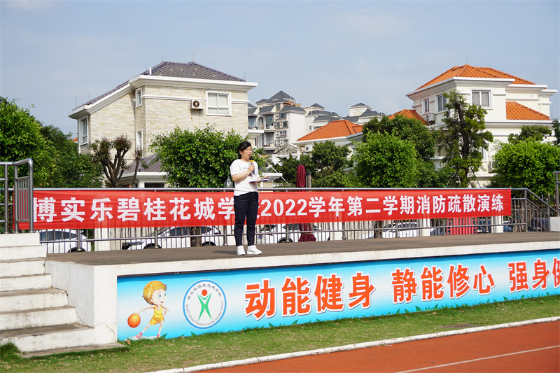 德育处郭园主任对本次消防安全应急疏散演练活动的完成时间、疏散过程、逃生路线、安全指引等细节问题做总结讲话,强调一旦身边发生突发事件,一定要沉着应对,有序撤离。最后,郭园还对全体师生进行了一次假期安全专题培训。