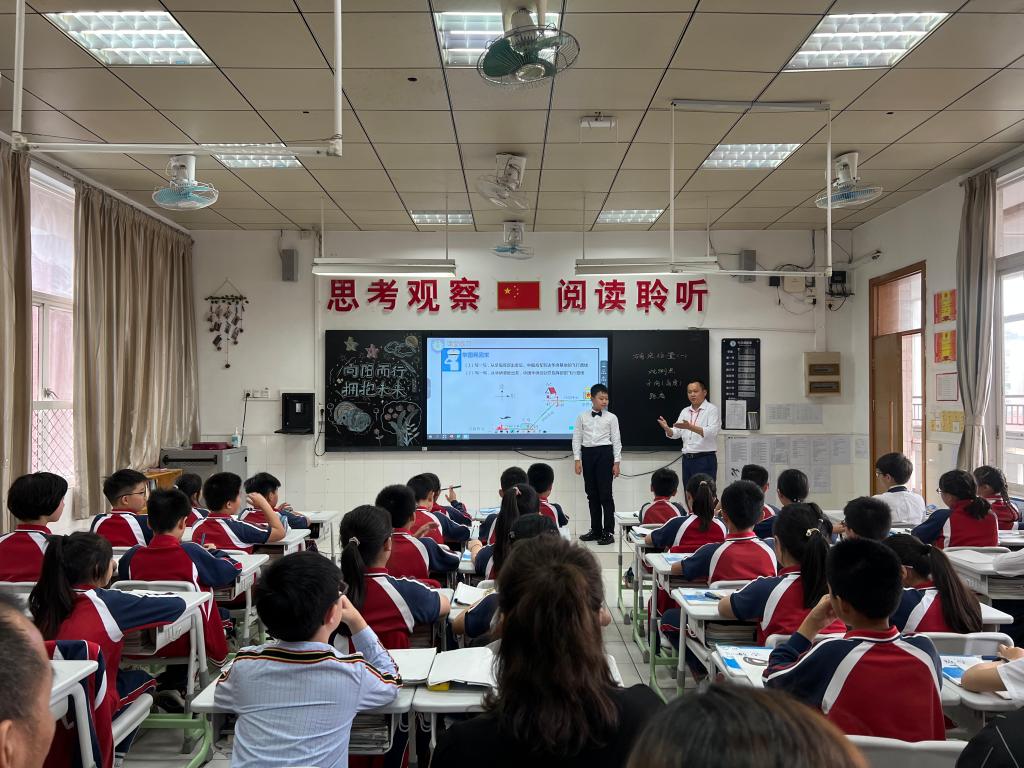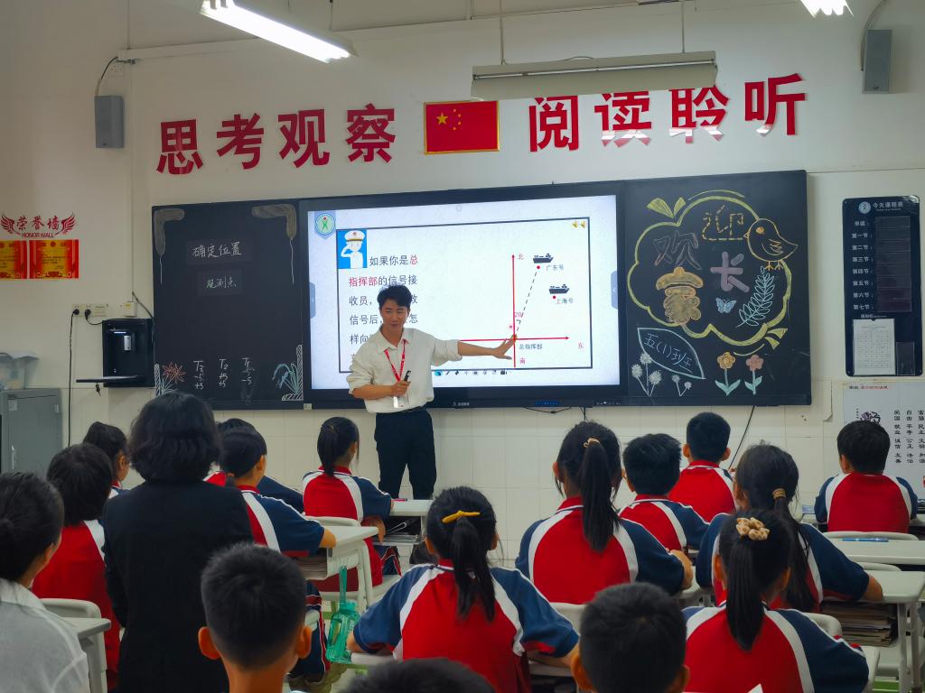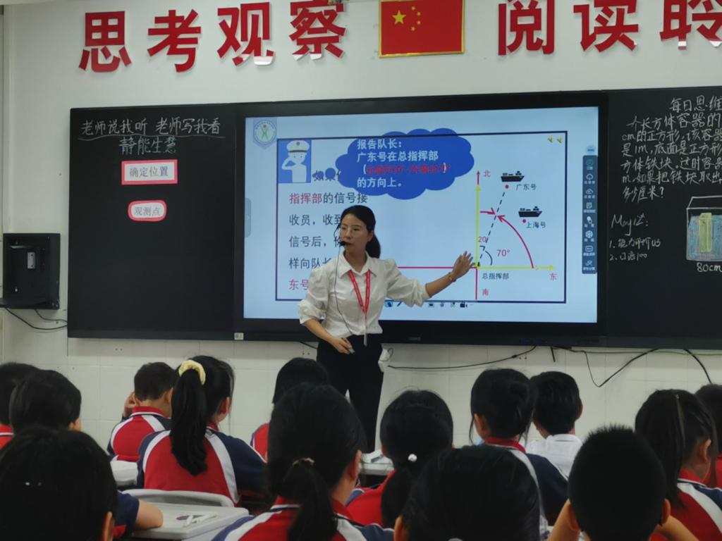 本次选择展示的数学课堂是《确定位置》,非常好地结合了小学五年级学生的认知水平和思维方式。老师们以电影《红海行动》中的救援任务为主线,引导学生用可视化的图呈现出来确定位置的条件,一个一个图形向孩子们解释,让孩子们明白确定位置背后的道理在哪里。