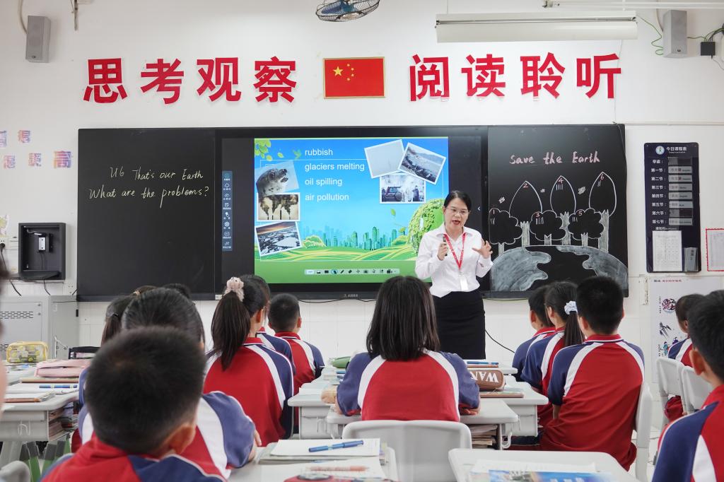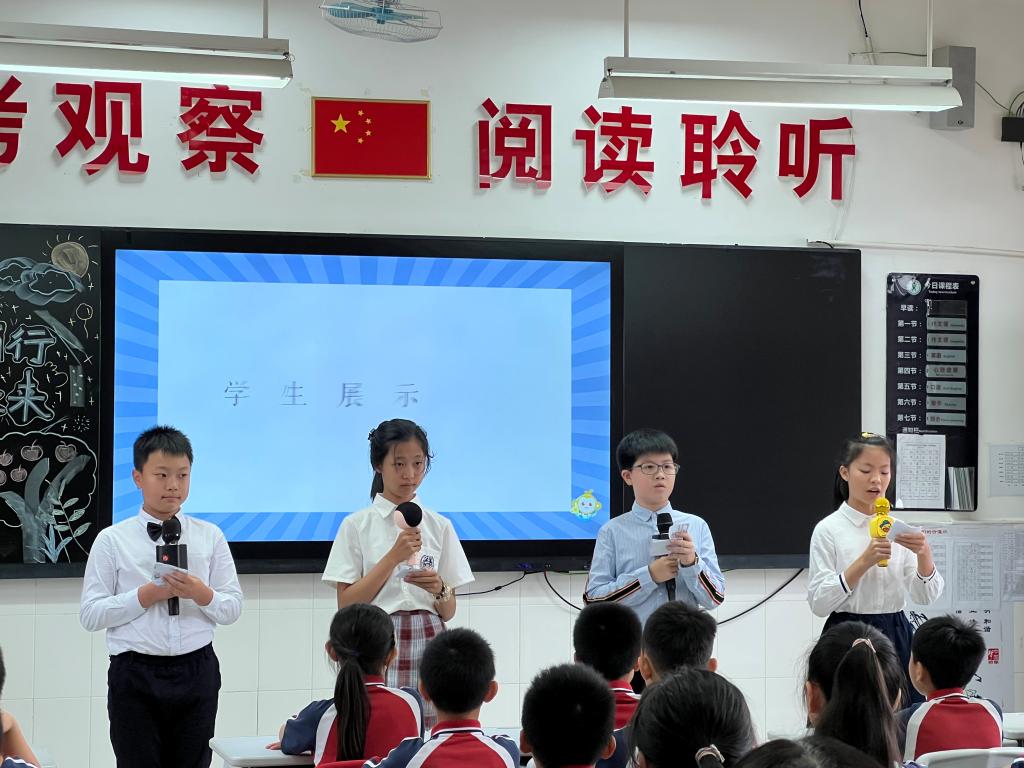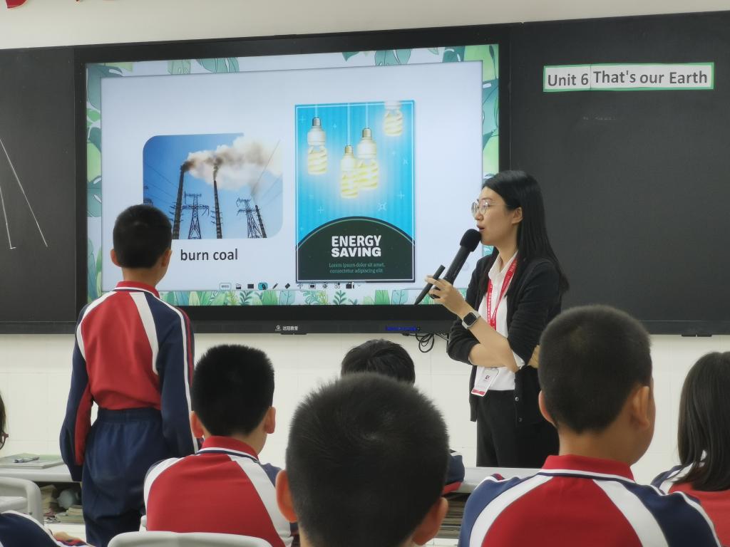 五年级英语老师的课程主题是《U6 That's our Earth》。本课是一次复习课,老师们以贴近主题的歌曲作为开头,让学生热身复习单词,然后进入正式的复习部分。学生以小组合作互帮互助的方式探讨“How can we help? What are the problems on the Earth?” 并进行小组调查形成一份报告,在班级上进行展示。在复习知识和输出报告的过程中,老师们引导学生了解地球,养成保护地球的意识,增加他们的责任感,激发了学生的民族情怀。