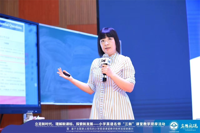 除了课堂教学观摩外,名师们还分享了深度研修专题,如:《基于主题意义探究的英语学习活动设计与实施》《新课标视域下如何精准设定有效教学目标》《单元备课做好整体规划,统筹单课效度》等。在名师的专业引领下,听课老师也深受启发,在学习研讨中不断对自己教学中“如何创设英语学习情境、如何落实小学英语核心素养”等方面进行了深度的思考。